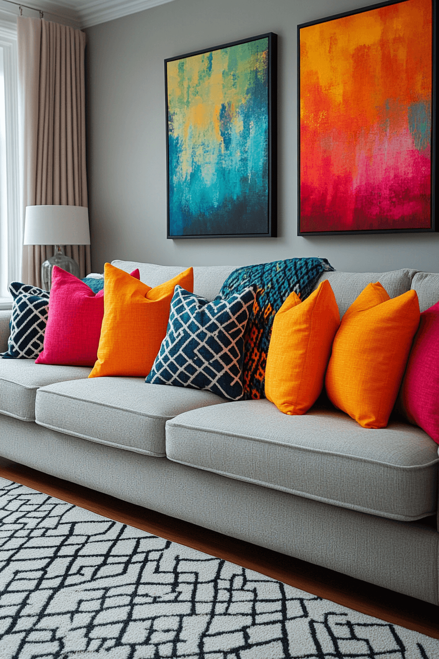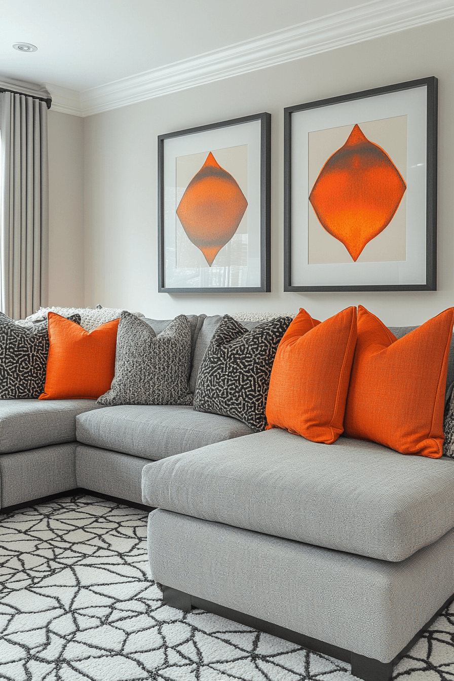 Geometric prints can bring energy and rhythm into a grey couch living room without overpowering the space. The grey couch pairs effortlessly with patterned cushions and rugs that feature bold, structured shapes. These designs add a modern edge while keeping everything visually balanced. Clean-lined furniture and minimal decor help the patterns stand out beautifully. The space feels lively, artistic, and thoughtfully styled. Tap to explore more grey couch living room ideas with geometric flair.
