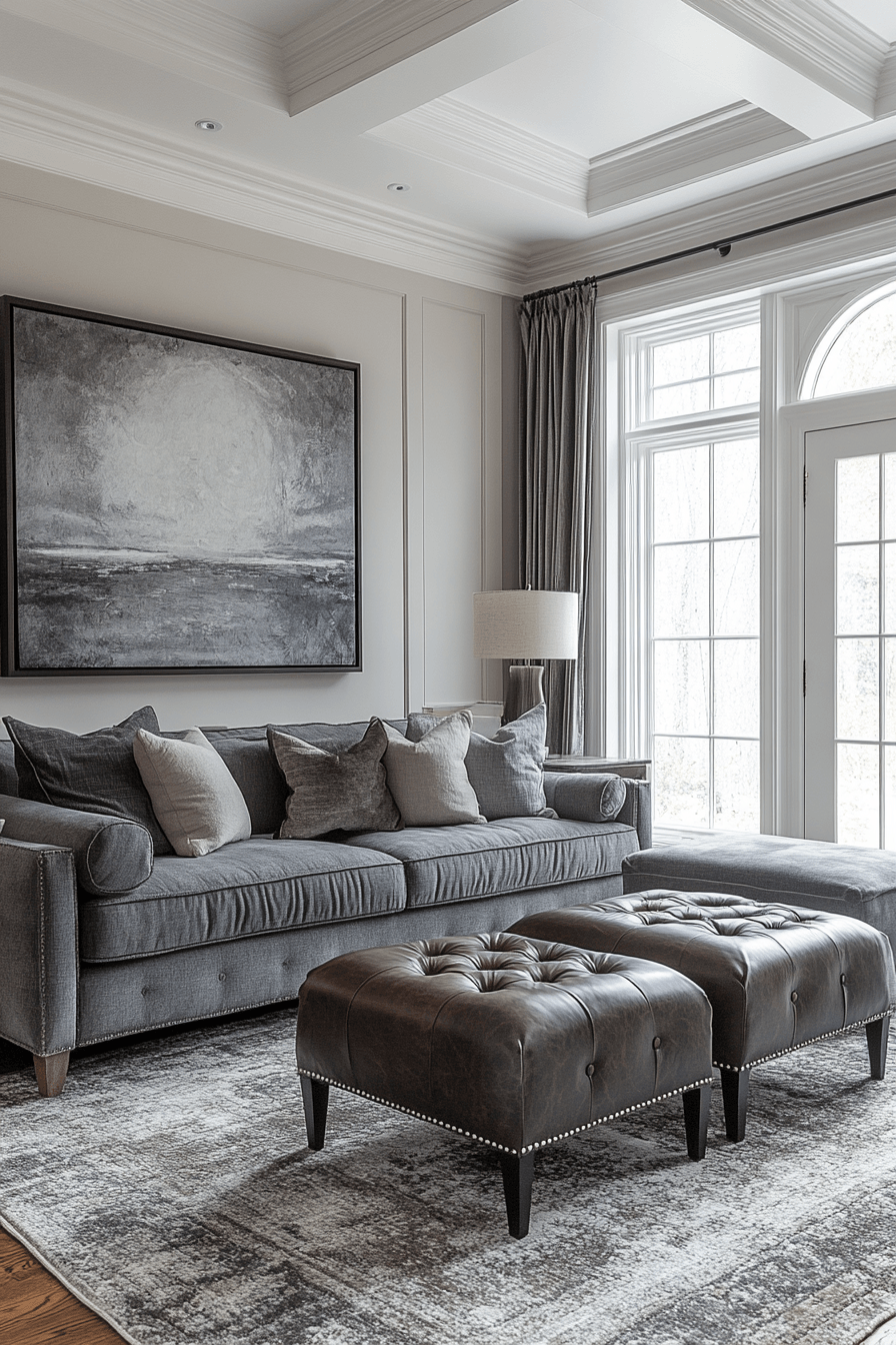 Combining soft and structured materials can give a grey couch living room a balanced, elevated feel. The grey couch looks stunning alongside leather accents like ottomans or accent chairs. This contrast creates a modern yet welcoming atmosphere that feels both refined and comfortable. Wooden elements and layered textiles help tie everything together beautifully. The result is a space that feels grounded, cozy, and sophisticated. Tap to uncover more grey couch living room ideas with leather details.