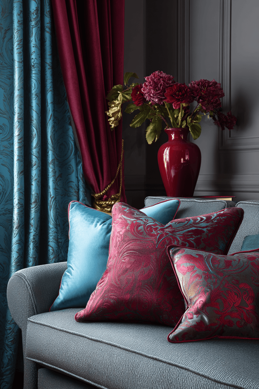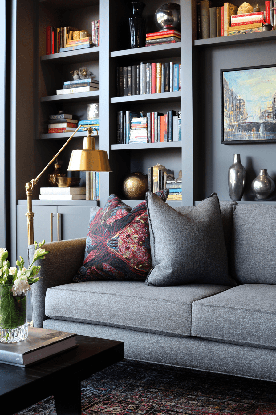 Deep, vibrant tones can elevate a grey couch living room into a bold and luxurious statement space. The grey couch pairs perfectly with jewel-inspired colors like emerald, sapphire, and ruby. These rich accents bring depth and personality while maintaining an elegant feel. Metallic finishes and plush fabrics add an extra layer of glamour. The overall design feels dramatic, refined, and full of character. Click to explore more grey couch living room ideas with striking color accents.