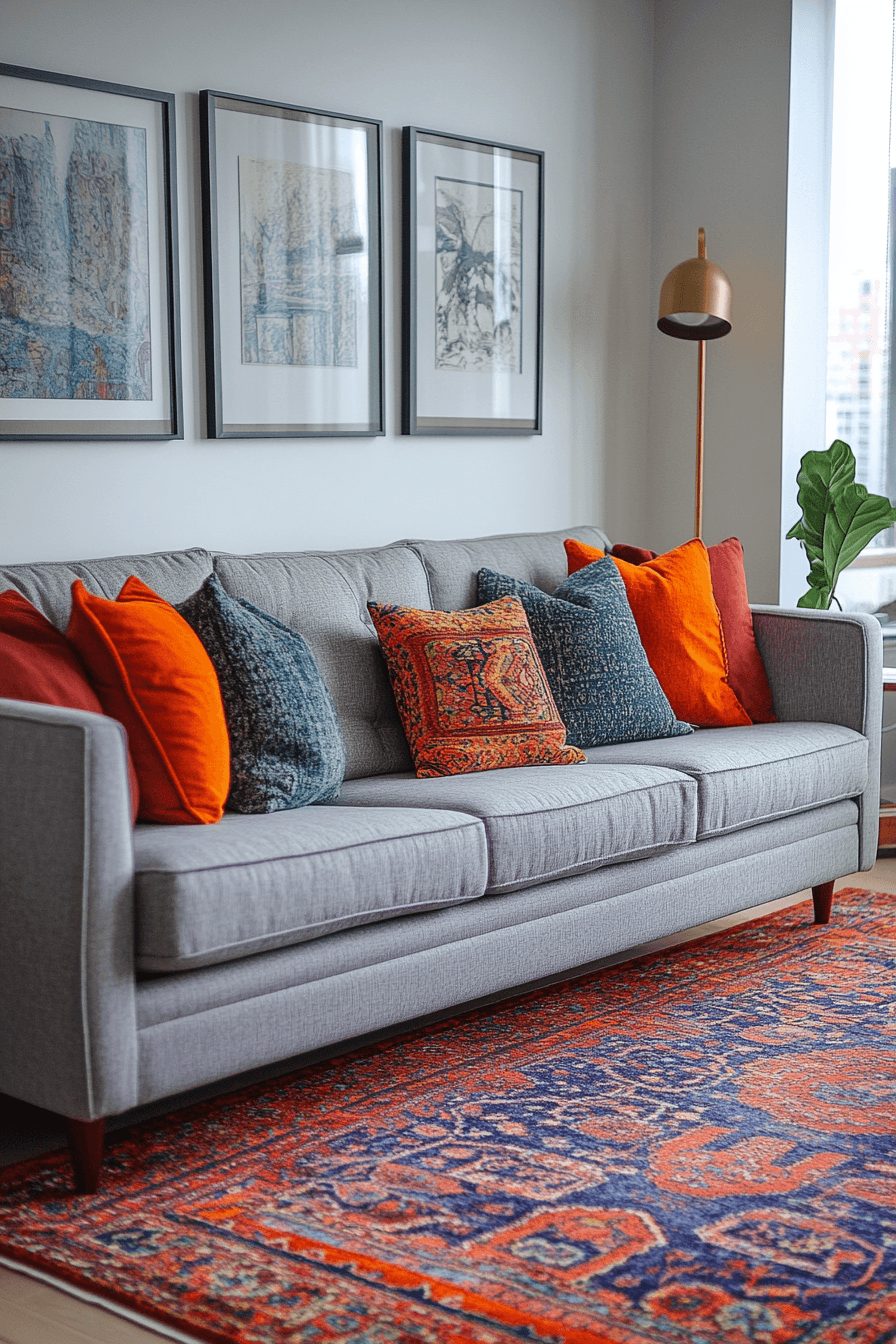Statement rugs can completely transform a grey couch living room by adding movement, color, and visual excitement. The grey couch pairs effortlessly with eye-catching patterns that bring life to the floor. These bold rugs become the focal point while keeping the rest of the decor simple and balanced. Subtle accents help tie everything together without overwhelming the design. The space feels dynamic, stylish, and full of energy. Click to explore more grey couch living room ideas that feature standout rugs.