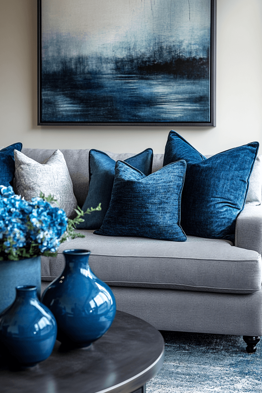 Cool-toned accents can shape a grey couch living room into a serene and sophisticated retreat. The grey couch pairs beautifully with shades of blue through artwork, textiles, and decor. This combination creates a calming atmosphere that feels both modern and timeless. Layered fabrics add comfort while maintaining a refined look. The space feels peaceful, balanced, and effortlessly elegant. Click to explore more grey couch living room ideas with calming color palettes.