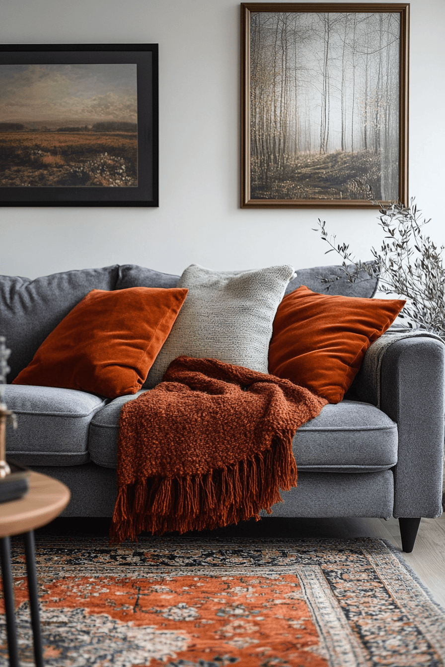 Warm hues can bring energy and depth into a grey couch living room while keeping it welcoming and cozy. The grey couch stands out when paired with rich tones like rust, terracotta, or deep red. Wooden finishes and soft lighting enhance the warmth throughout the space. This contrast creates a room that feels dynamic yet comfortable. The overall look is inviting, stylish, and full of personality. Tap to discover more grey couch living room ideas with warm accents.