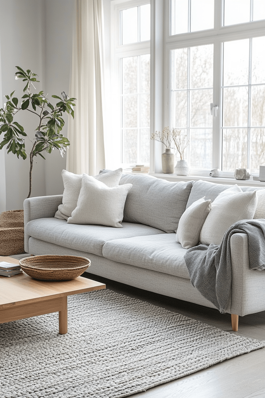 Light woods and crisp whites can shape a grey couch living room into a bright, Scandinavian-inspired retreat. The grey couch blends seamlessly with airy elements and simple, functional furniture. Cozy textiles—like knits and soft rugs—add warmth without overwhelming the space. Subtle patterns keep things interesting while maintaining a minimalist feel. Everything looks fresh, open, and easy to live in. Tap to see more grey couch living room ideas with Scandinavian charm.