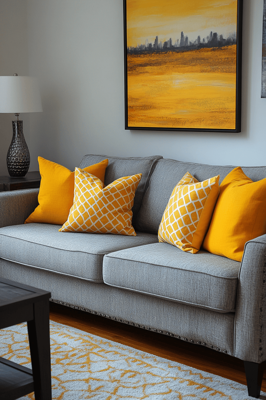 Bright accents can instantly energize a grey couch living room and make it feel lively and uplifting. The grey couch comes to life with pops of yellow through pillows, decor, or artwork. This cheerful contrast adds personality while keeping the base neutral. Soft textures and playful details enhance the vibrant feel. The space feels fun, stylish, and full of positive energy. Click to discover more grey couch living room ideas that add a splash of color.