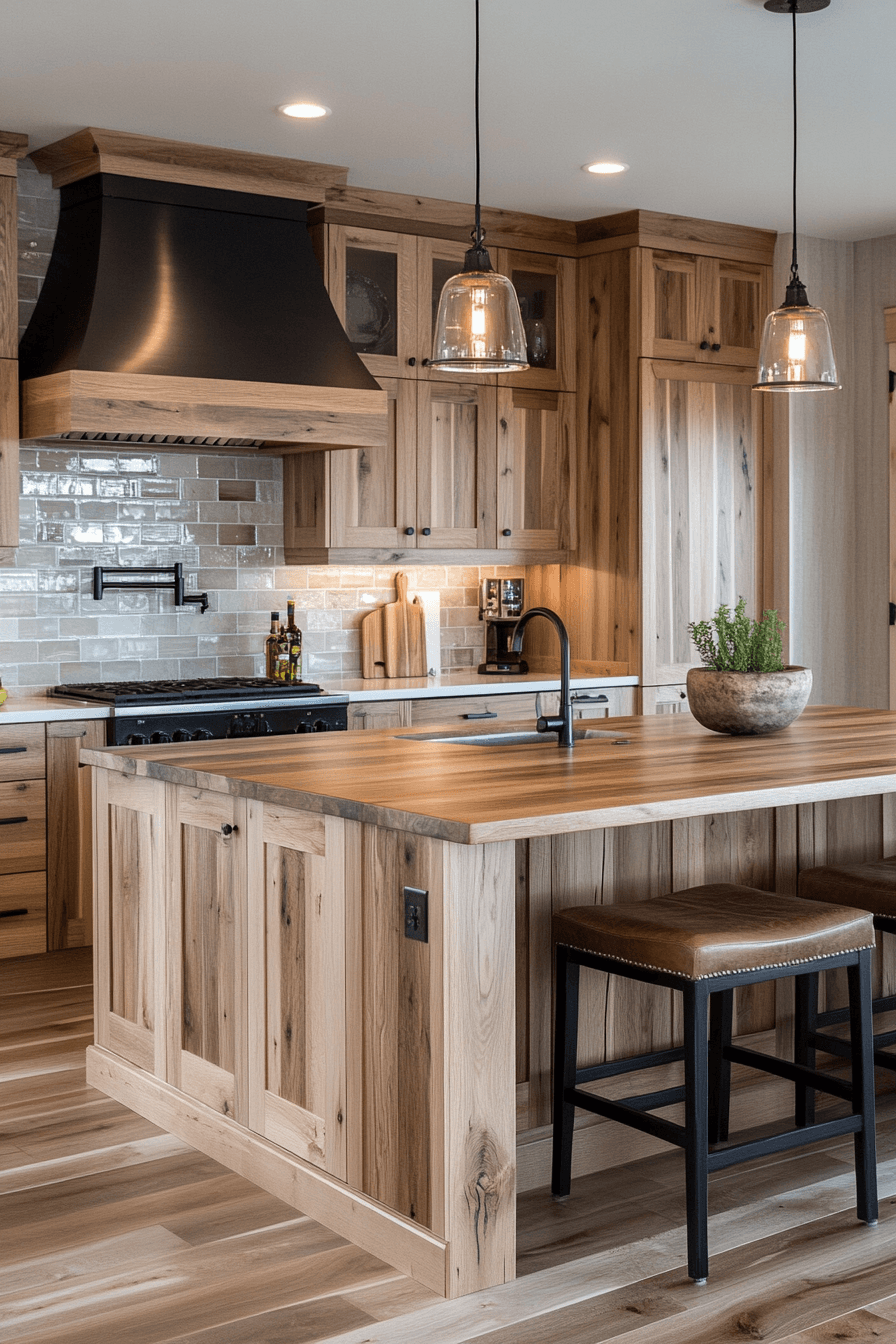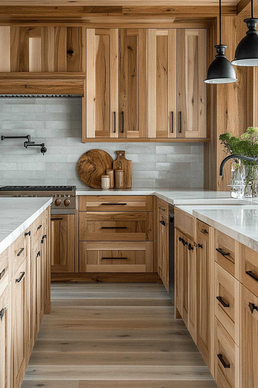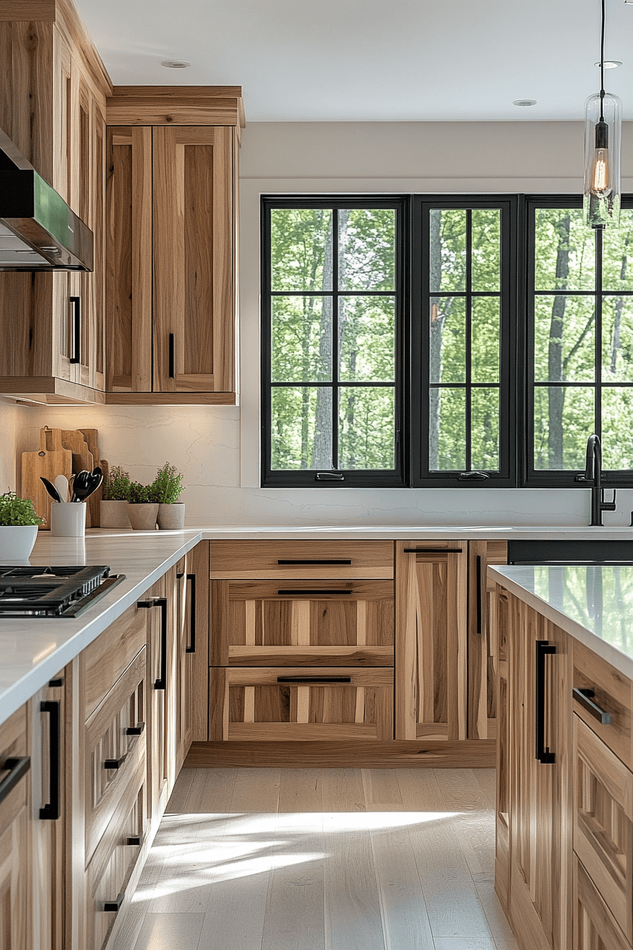Contemporary rustic style brings together sleek design and natural warmth through hickory kitchen cabinets. Flat-front cabinetry and simple hardware keep the look modern and clean. Hickory kitchen cabinets add texture and character without making the space feel heavy. Pairing them with stone surfaces or subtle greenery enhances the contrast. The result is a kitchen that feels fresh, balanced, and full of life. Click to explore modern rustic ideas that feel effortlessly stylish.