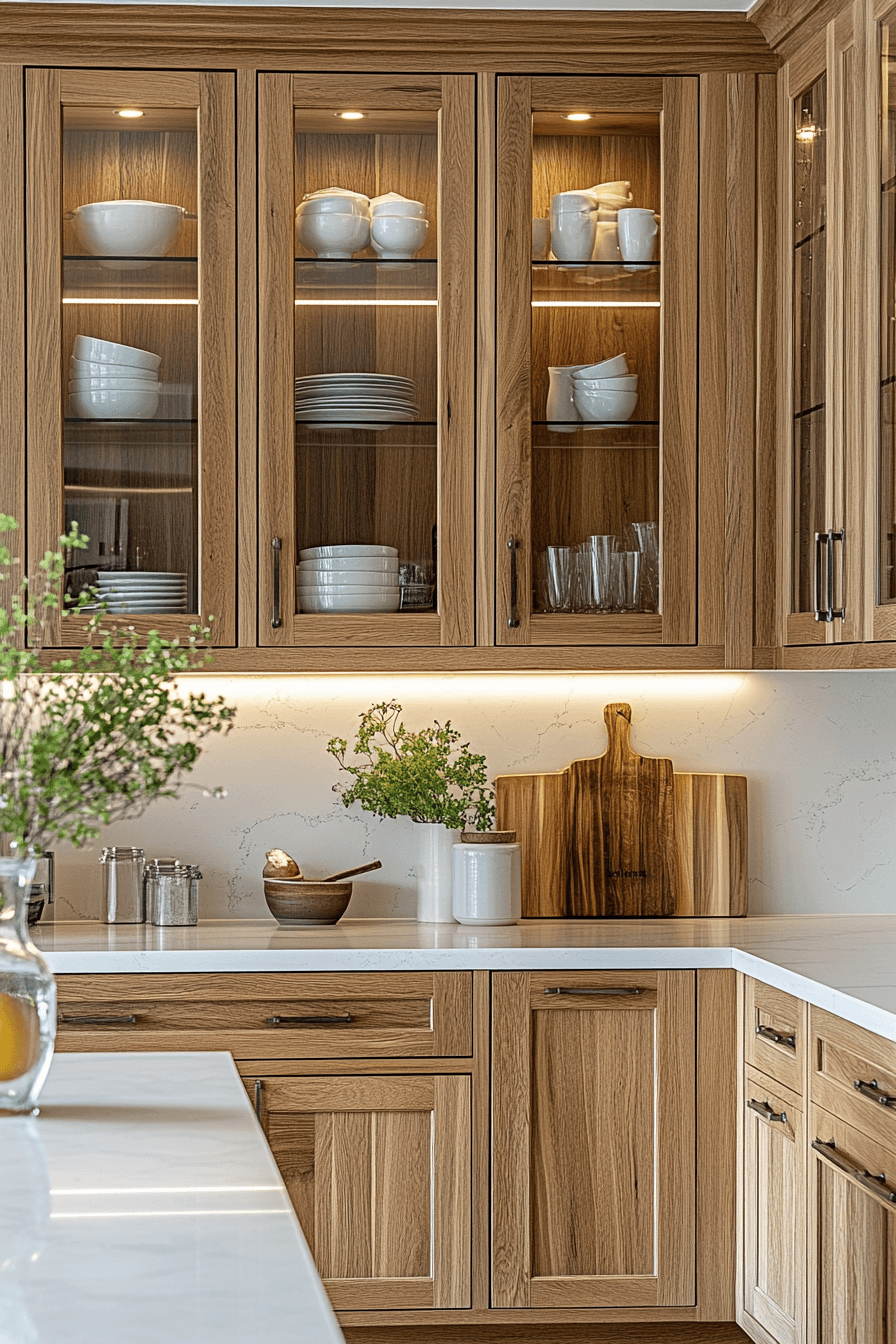 Glass-front details add lightness and dimension to hickory kitchen cabinets while still showcasing their rich tones. The mix of transparent panels and bold wood grain creates a visually balanced design. Hickory kitchen cabinets with glass inserts can be styled with either clear or frosted finishes depending on your preference. This approach helps brighten the space and makes it feel more open. It’s also perfect for displaying favorite dishes or decorative pieces. Click to explore designs that blend openness with rustic charm.