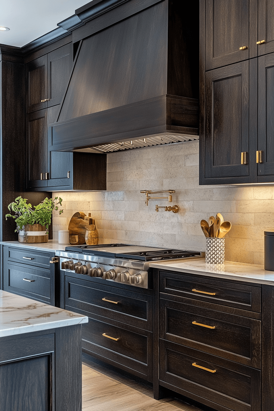 A darker stain on hickory kitchen cabinets creates a bold, dramatic look while still highlighting the wood’s natural texture. The deeper tones add richness and sophistication, especially in larger kitchen spaces. Hickory kitchen cabinets with this finish pair beautifully with marble surfaces or warm metallic accents. Even with the darker color, the grain still stands out and adds depth. The result feels elegant yet full of character. Tap to discover how dark hickory can bring a refined edge to your kitchen.
