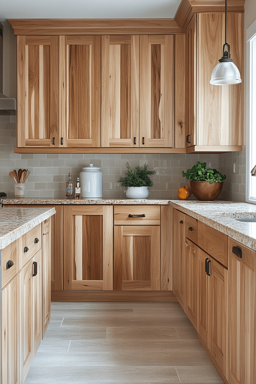 Lighter finishes on hickory kitchen cabinets help brighten the entire kitchen while still showcasing the wood’s natural beauty. The soft golden tones reflect light and make the space feel open and welcoming. Hickory kitchen cabinets in lighter shades pair well with white, cream, or soft gray accents. This makes them a great fit for farmhouse or Scandinavian-inspired interiors. The gentle contrast in the grain adds subtle movement without overwhelming the design. Click to explore light hickory styles that bring warmth and brightness together.