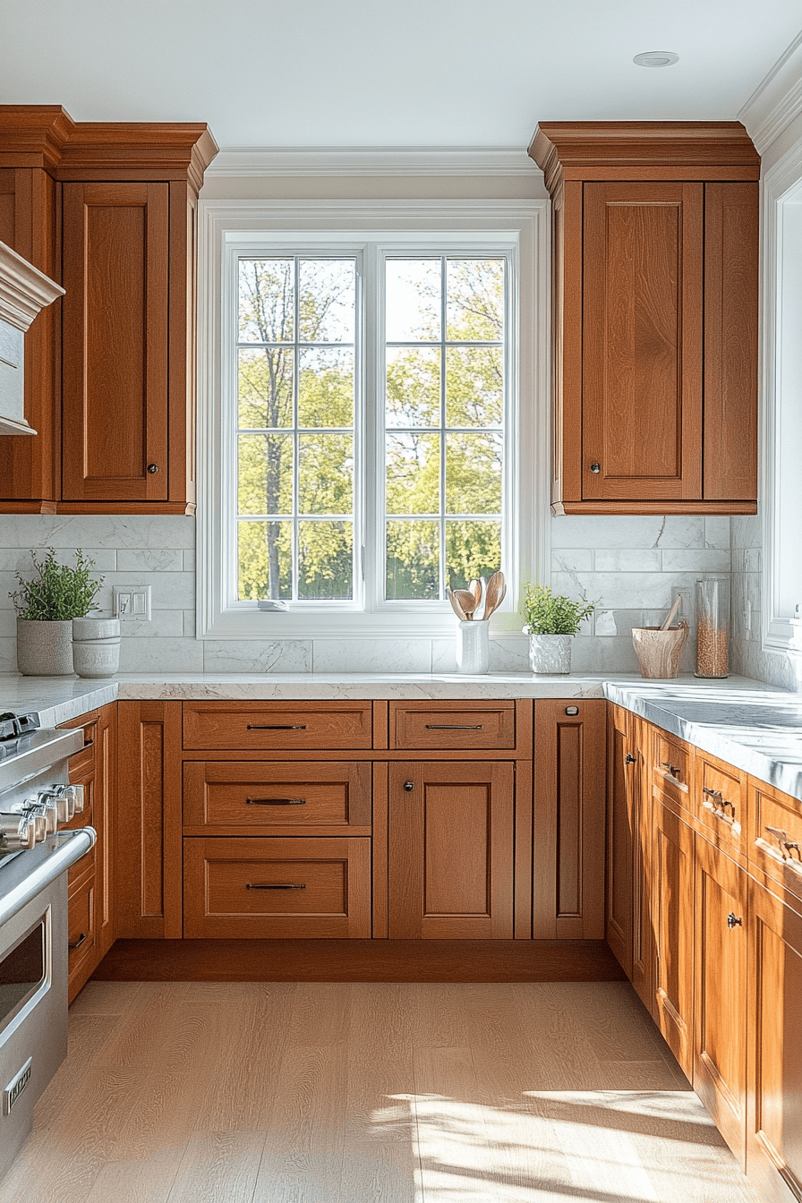 Bright and cheerful energy flows naturally through a space styled with honey oak kitchen cabinets. Their reflective wood tones help bounce light around, making the kitchen feel open and full of life. Honey oak kitchen cabinets look especially stunning when paired with white surfaces or natural sunlight. The entire room feels fresh, energized, and welcoming. It’s the kind of space that instantly lifts your mood. Discover more bright kitchen ideas that bring warmth and positivity into your home.