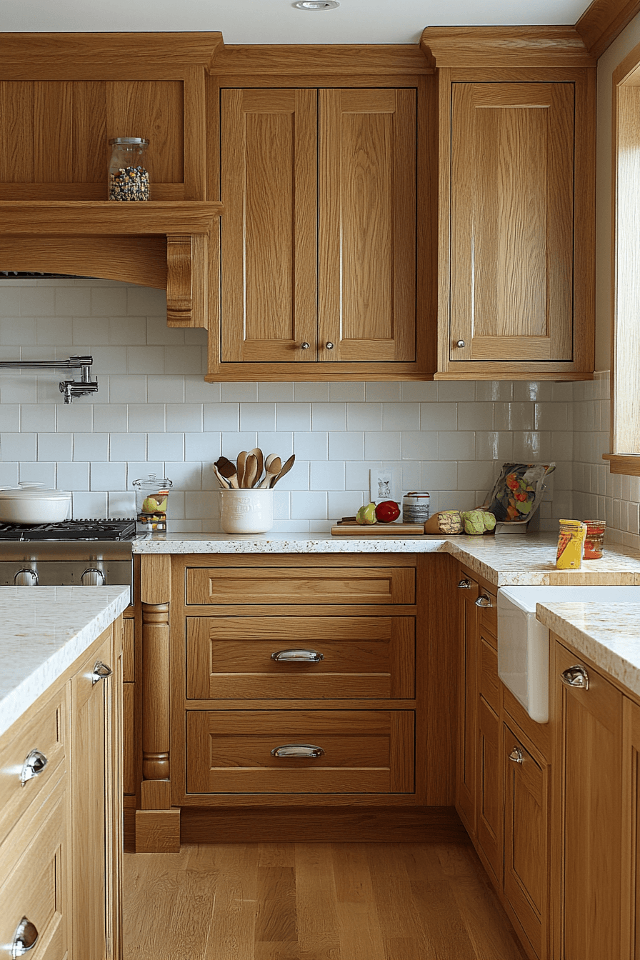 Subtle elegance shines through when honey oak kitchen cabinets are styled with a soft, refined touch. Their delicate grain and warm tones create a look that feels graceful and inviting. Honey oak kitchen cabinets pair effortlessly with creamy whites, soft pastels, or brushed gold accents. The overall effect is polished without feeling too formal. It’s a beautiful balance of comfort and sophistication. Click to discover kitchen ideas that bring quiet elegance to life.