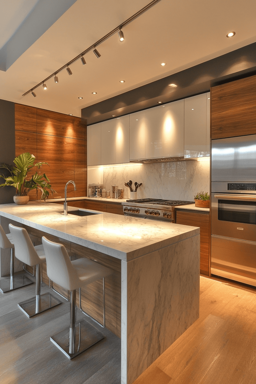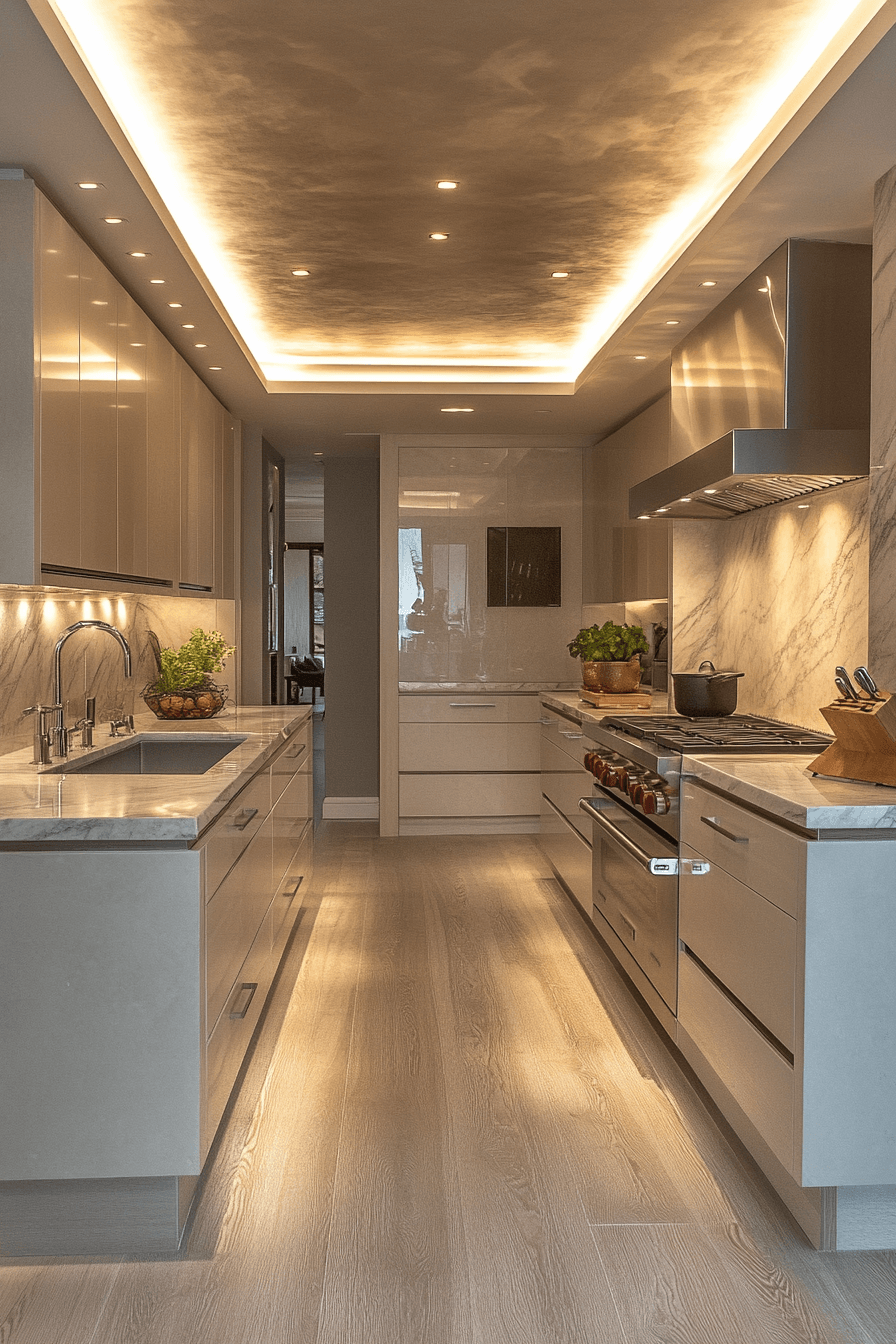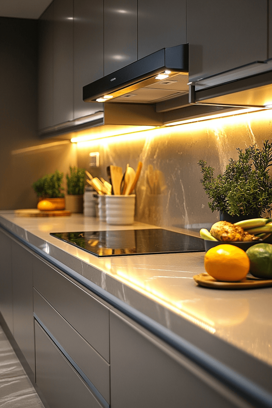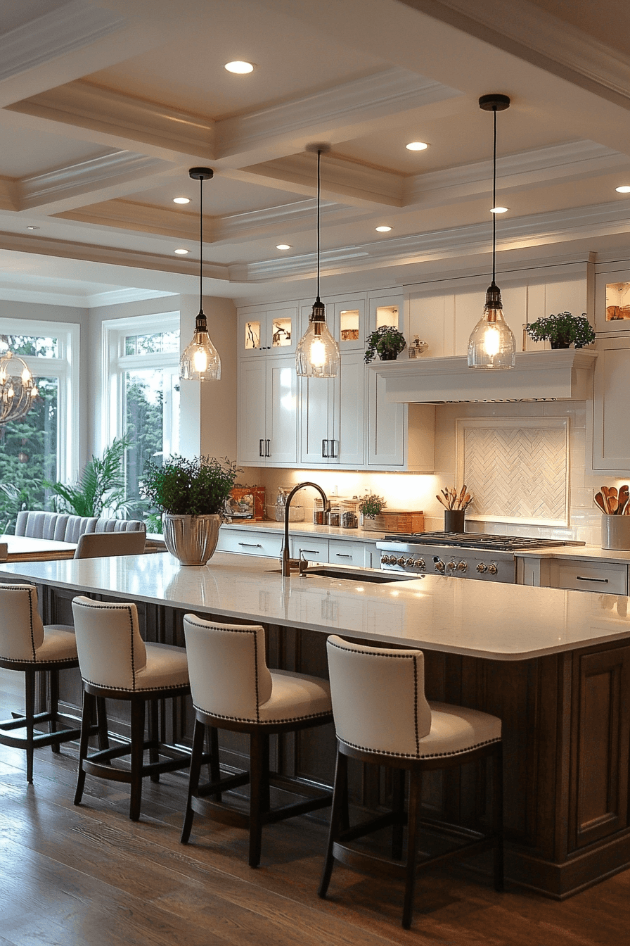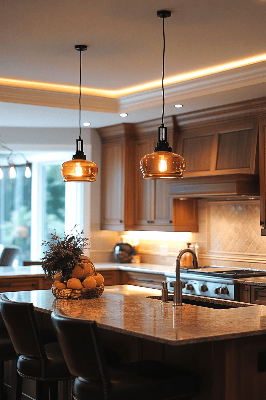 Ceiling halo designs add a soft, modern glow that instantly elevates your favorite kitchen lighting ideas. Their recessed style creates a subtle ring of light that feels calm and inviting. The illumination spreads evenly across the space without feeling harsh. These fixtures work especially well in sleek, minimalist kitchens where clean lines matter. They enhance the mood while keeping the overall look uncluttered. Click to explore halo-inspired kitchen lighting ideas that feel effortlessly refined.