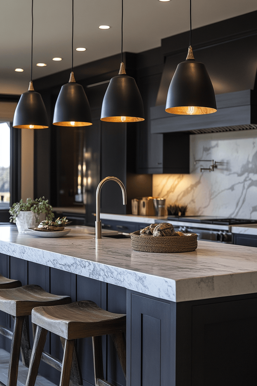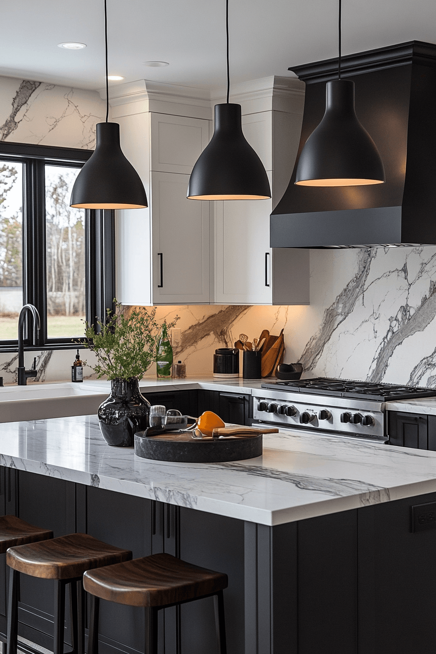 Black fixtures are bold kitchen lighting ideas that instantly create contrast and visual interest. Against lighter cabinets or walls, they really stand out in a stylish way. They work well with modern, minimalist, or even industrial designs. Black accents help ground the space and give it a more finished look. Pairing them with matching hardware ties everything together. Click to explore black lighting ideas that make your kitchen pop.