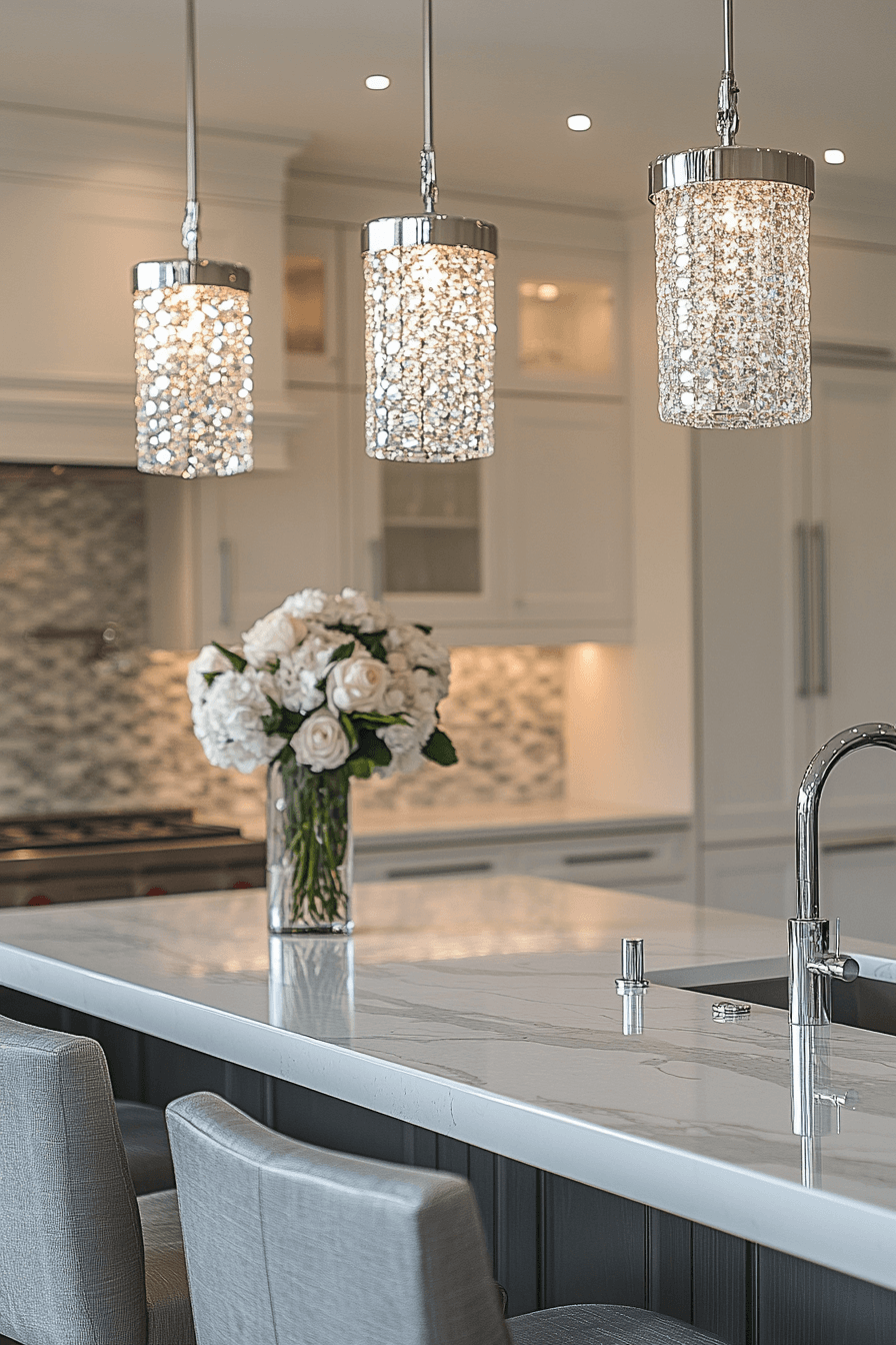 Crystal pendants are eye-catching kitchen lighting ideas that instantly make your space feel brighter and more luxurious. The faceted surfaces reflect light beautifully, creating a subtle sparkle throughout the room. Hung over an island or dining area, they naturally become a focal point. They work well in both modern kitchens and more classic setups. The added shine gives your kitchen an elevated, polished feel. Tap to explore crystal lighting ideas that bring a little glamour into your home.