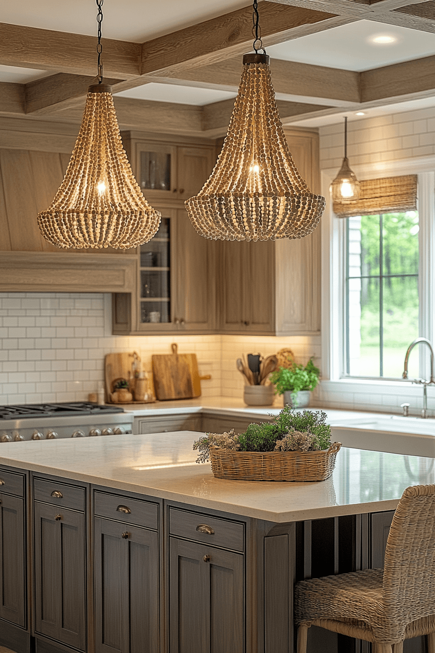 Beaded chandeliers bring a handcrafted, cozy charm to farmhouse-style kitchen lighting ideas that instantly make the space feel special. The layered beads create beautiful texture and gentle movement that catches the eye. As light filters through, it gives off a soft, warm glow that’s perfect for gathering areas. Placed above an island or dining table, they naturally become a focal point. The look feels inviting while still having a refined touch. Tap to explore beaded chandelier kitchen lighting ideas that add warmth and personality.