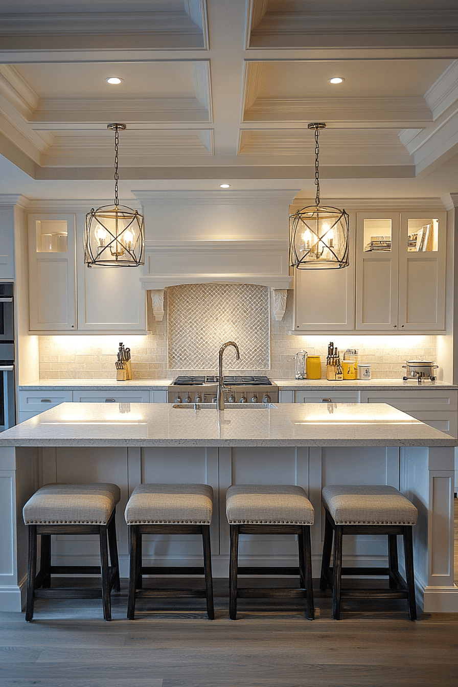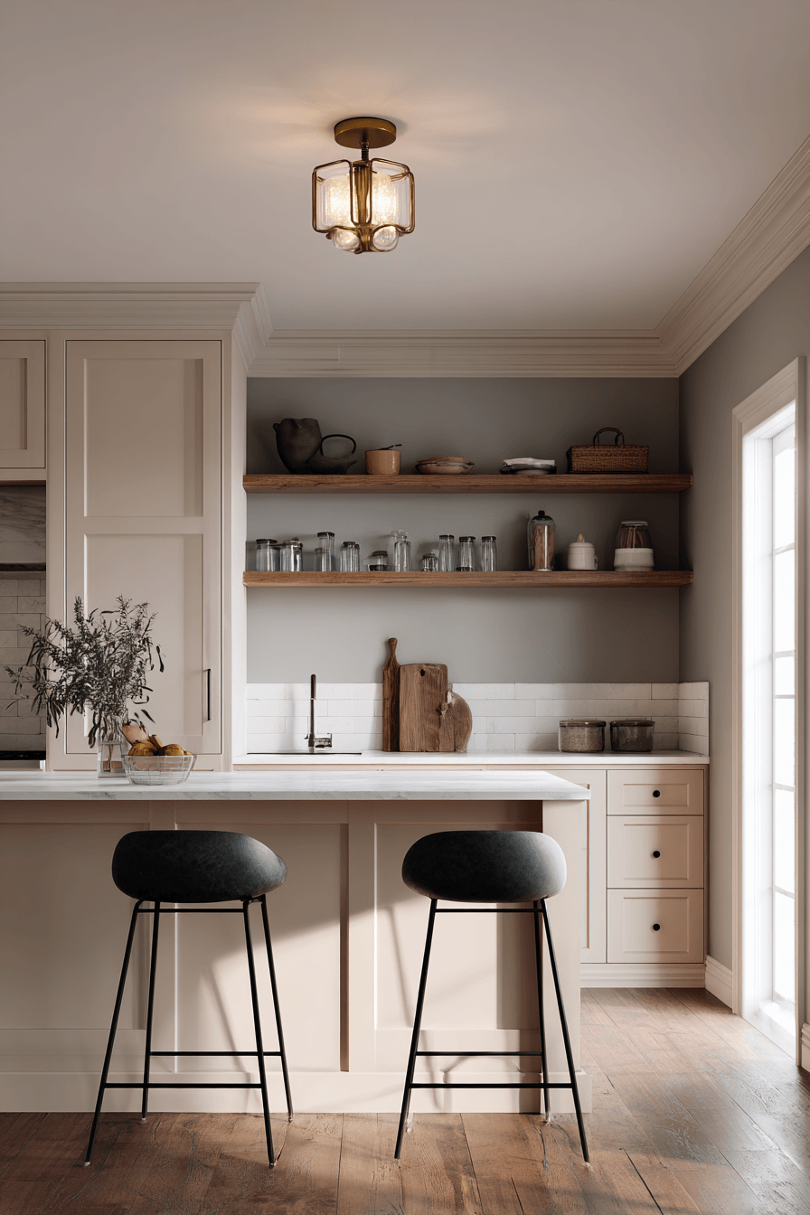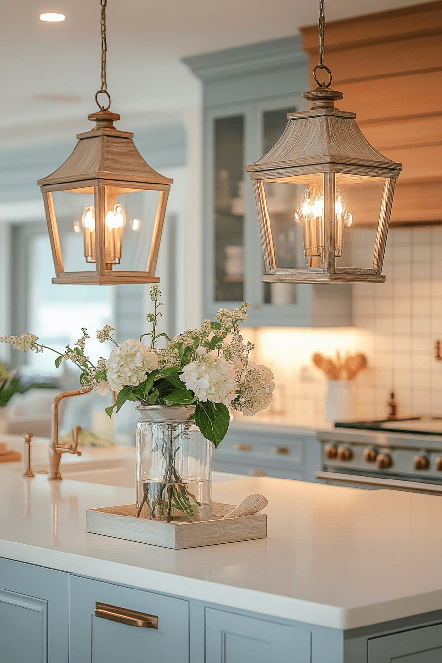 Coastal lantern fixtures are breezy kitchen lighting ideas that bring a relaxed, beach-inspired feel into your home. With their glass panels and simple metal frames, they give off a subtle nautical vibe. The light they cast feels soft and calming, perfect for an easygoing atmosphere. Paired with light woods and neutral tones, they enhance that coastal look effortlessly. The space ends up feeling fresh, open, and uplifting. Click to discover coastal kitchen lighting ideas that bring seaside charm indoors.
