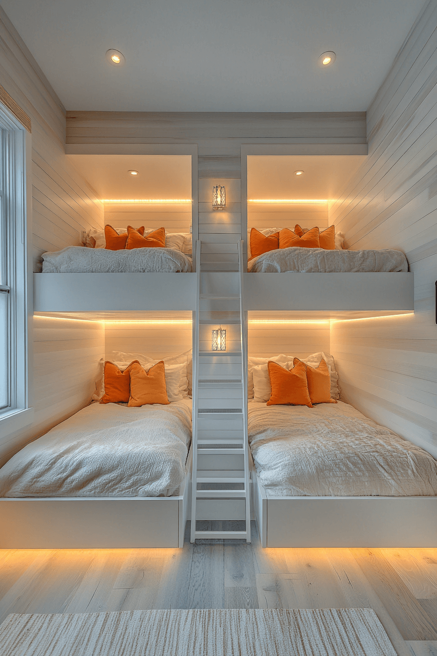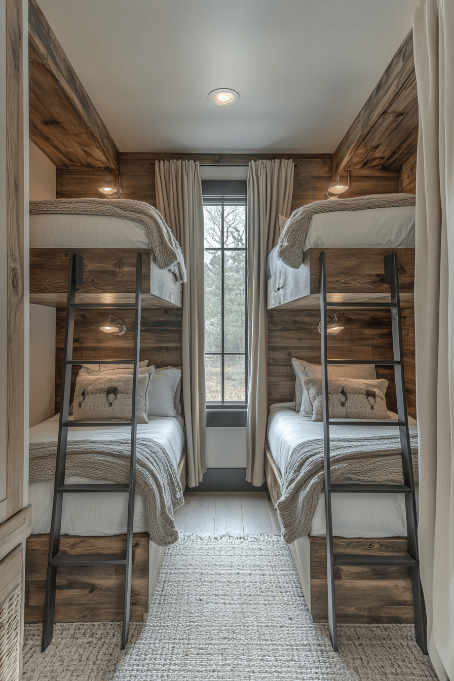 Create personal space in shared rooms with stacked loft beds for small rooms that offer two sleeping zones in one footprint. Each level can be customized with shelves, lighting, and decor for a personalized feel. This setup works great for siblings or roommates who want both privacy and style. It’s space-saving genius with a sleek design to match. Safety rails and smart design ensure comfort and peace of mind.