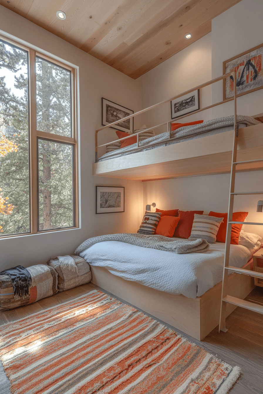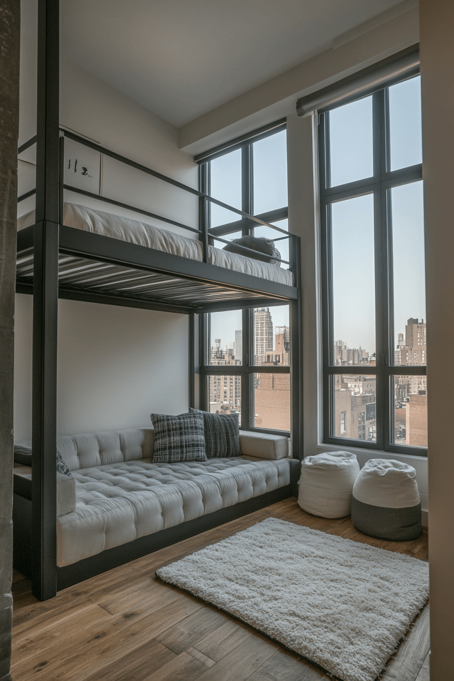 Loft beds for small rooms with a sleek, urban aesthetic offer the perfect blend of style and practicality. Featuring elevated beds and open space underneath, these designs are great for lounging, storing gear, or adding a compact desk. Wood and metal materials add a modern edge, ideal for teens and young adults. These beds keep things minimalist while making your room look effortlessly cool. You’ll love the airy feeling they bring to tight quarters.