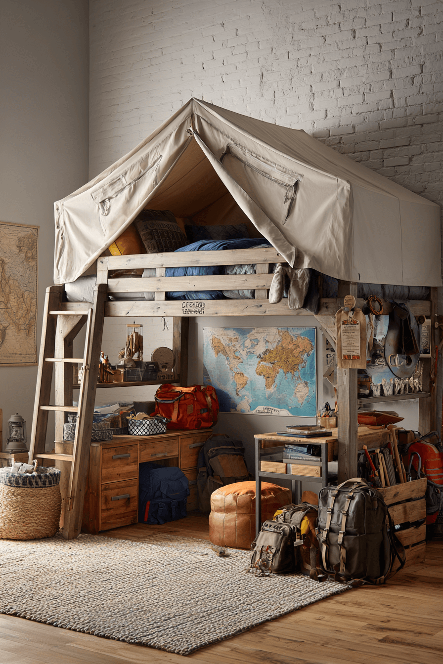 Adventure awaits with themed loft beds for small rooms that feel like a wilderness getaway. From tent-style canopies to nature-inspired panels, these beds transform bedrooms into playful worlds. Add storage or fun extras below to complete the look. It’s perfect for sparking the imagination while staying organized. Fun, functional, and full of spirit.