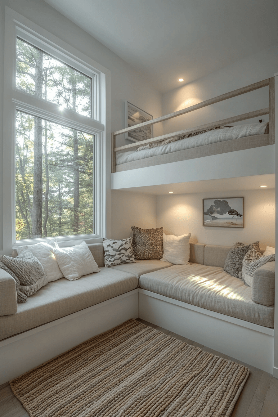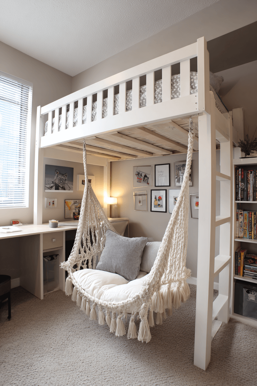 Add whimsy to your space with loft beds for small rooms that include a swing or hanging chair beneath. This playful detail invites relaxation and adds movement to the room. It’s the perfect reading nook or daydream spot, right beneath your elevated bed. Functional and fun, this layout brings serious personality to small bedrooms. It’s as joyful as it is clever.