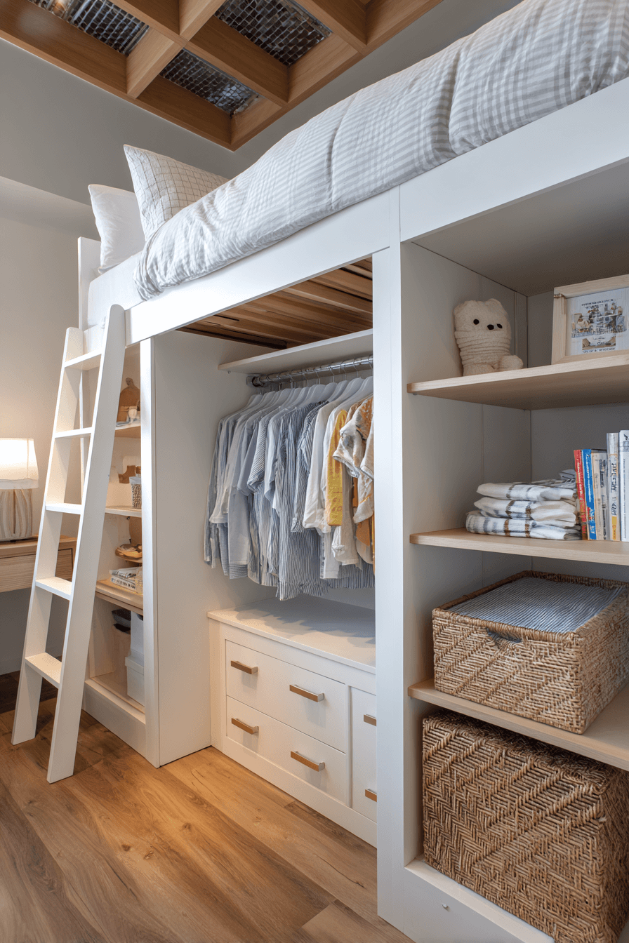 Transform your storage situation with loft beds for small rooms that feature built-in wardrobes. These vertical designs combine sleeping and organizing in one clever layout. Customize the wardrobe doors to match your decor and enjoy a seamless look. It’s perfect for rooms lacking closet space but full of potential. No more clutter—just streamlined storage.