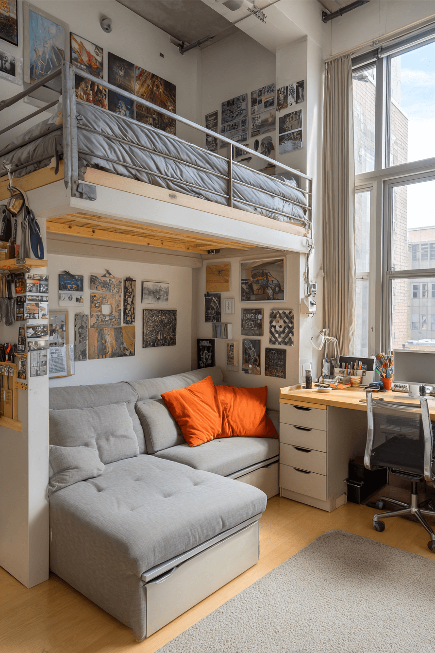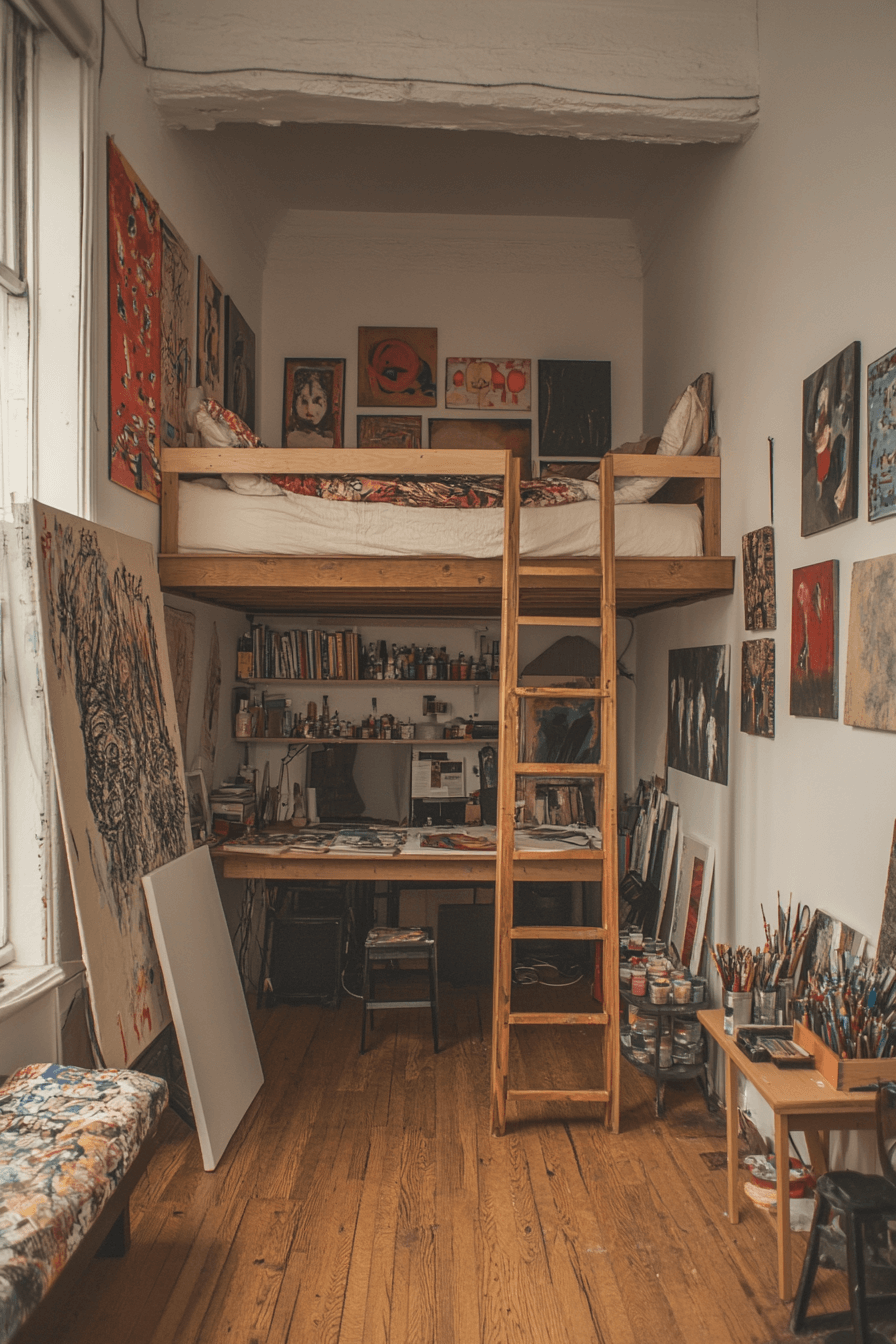 Design your dream studio with loft beds for small rooms that carve out space for passion projects. Whether you love painting, writing, or producing music, this setup makes it easy to stay inspired. Add shelving, lighting, and even a cork board beneath your bed. It’s compact, functional, and fuels creativity every day. Great for artists with limited space but unlimited ideas.