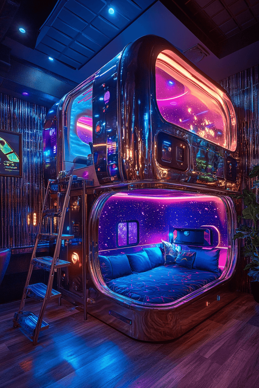 Turn bedtime into a space adventure with galaxy-themed loft beds for small rooms. Capsule-like designs, LED lighting, and cosmic details make the setup out of this world. It’s perfect for dreamers who love a futuristic twist in a small footprint. With sleek lines and imaginative features, this layout is both functional and fun. Even compact bedrooms can feel like a rocket launchpad.