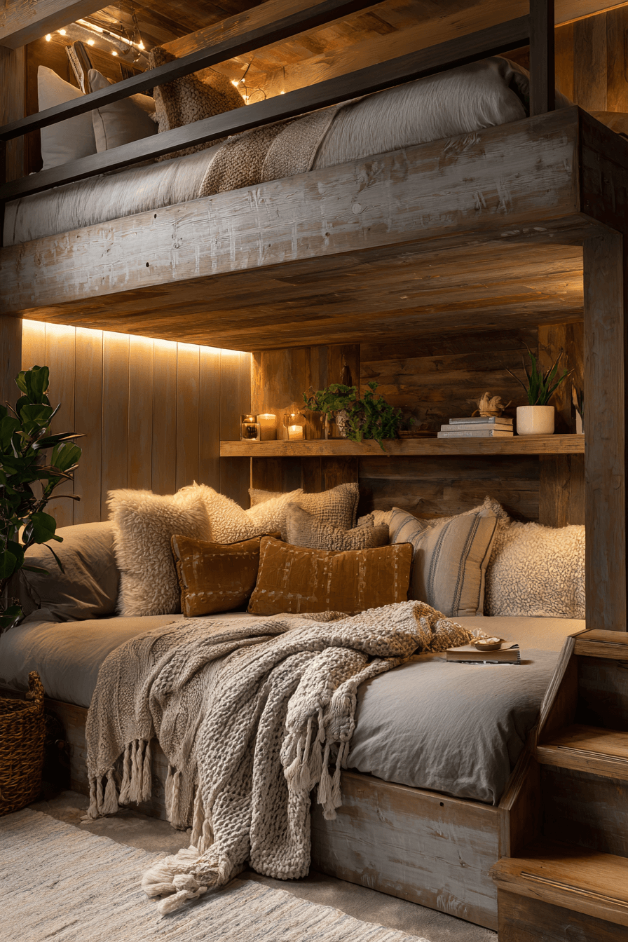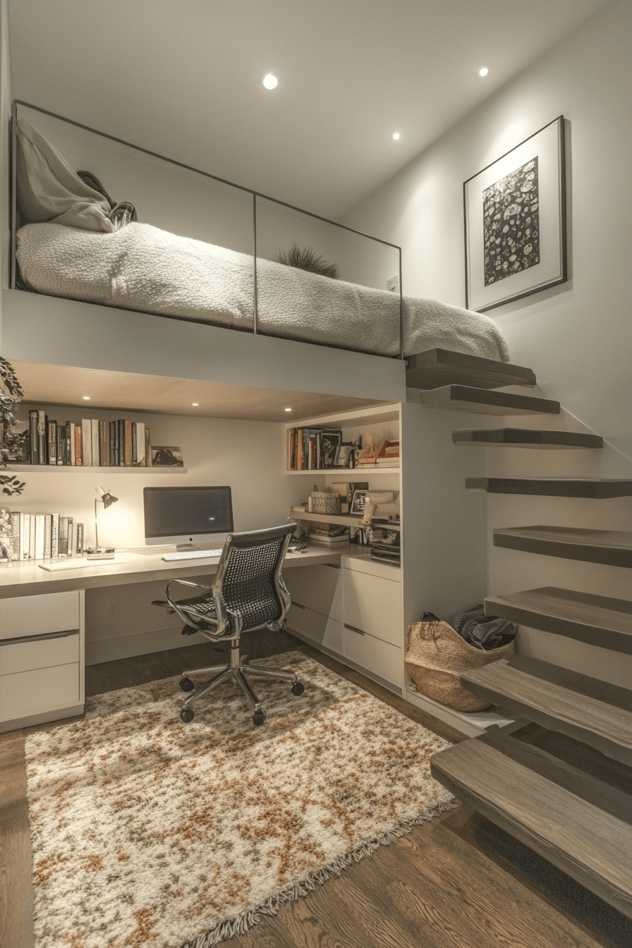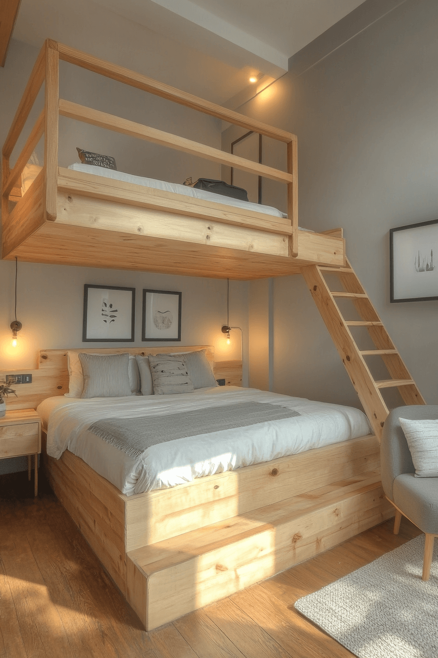 Add character to your space with rugged loft beds for small rooms that feature natural textures and warm materials. These beds offer storage, seating, or reading nooks beneath, all wrapped in earthy tones. It’s a cozy-meets-practical design that maximizes space without sacrificing personality. Perfect for creating a calming retreat in a small bedroom. The aesthetic is laid-back, stylish, and inviting.