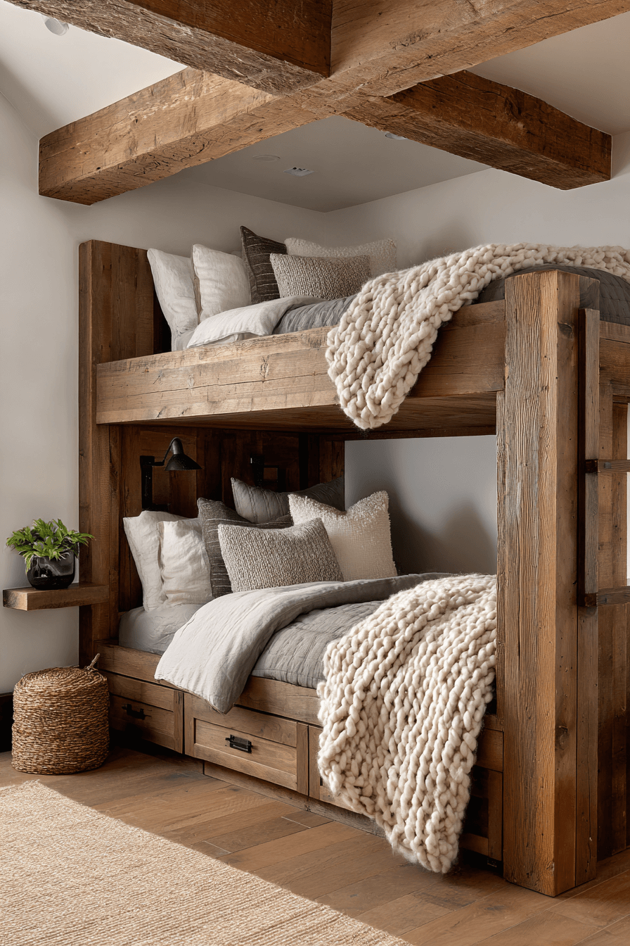 Bring the warmth of a log cabin indoors with rustic-style loft beds for small rooms. Featuring cozy wood finishes and rugged details, this design adds charm while saving space. Drawers or benches below the bed add function to the rustic flair. It’s an ideal pick for anyone craving a cozy aesthetic in a compact space. Think mountain retreat, but in your own room.