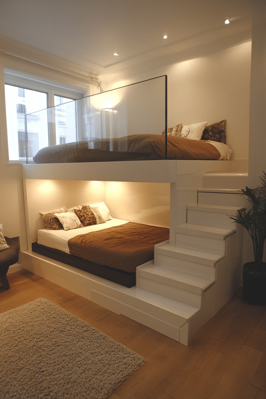 Sleep two in style with twin-level loft beds for small rooms that offer double the comfort without the bulk. This vertical layout separates sleeping areas and maximizes floor space. Each bunk can be customized for individual taste, from lighting to storage. It’s a practical and polished solution for shared rooms. Ideal for kids, siblings, or roommates.