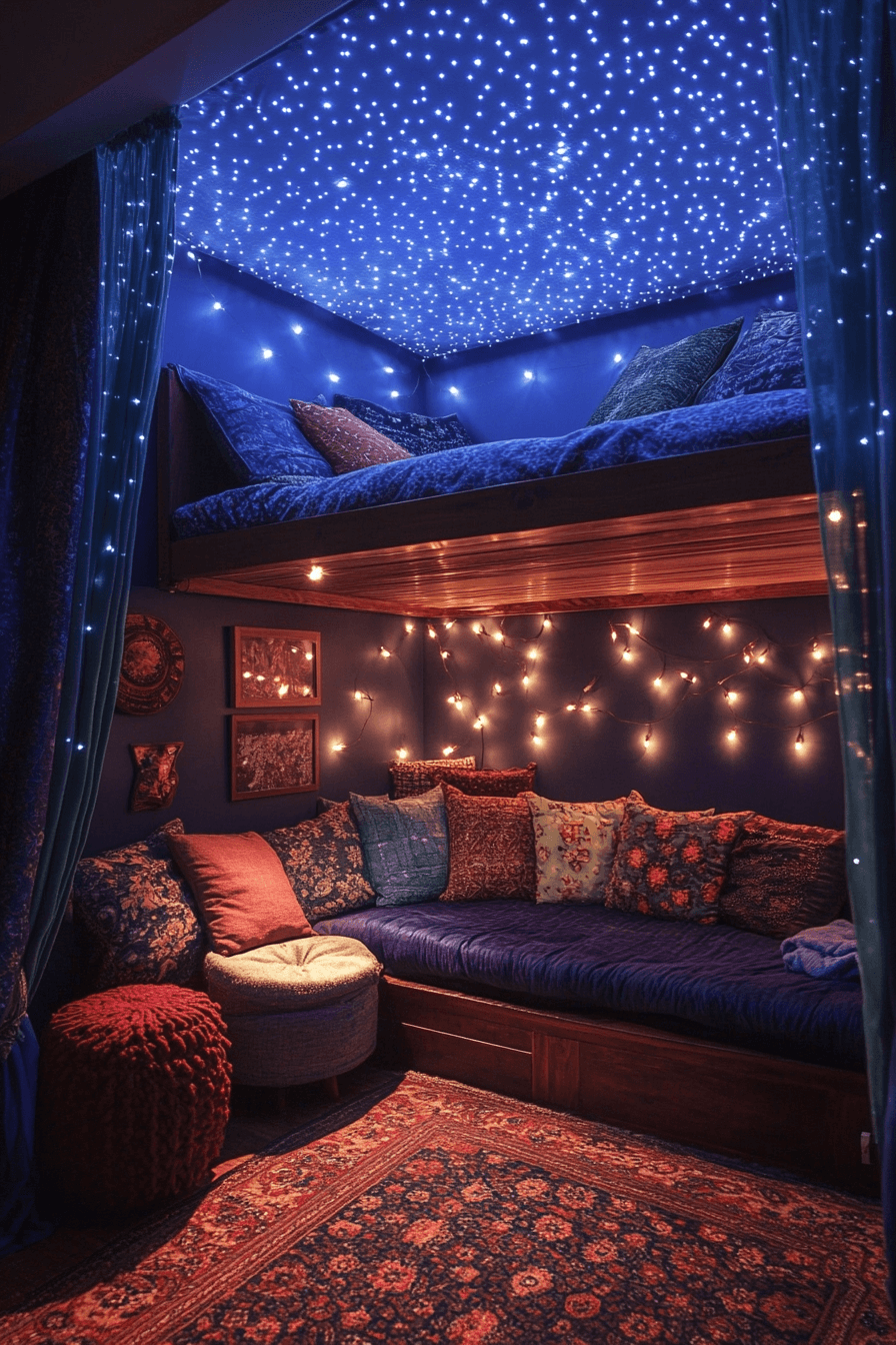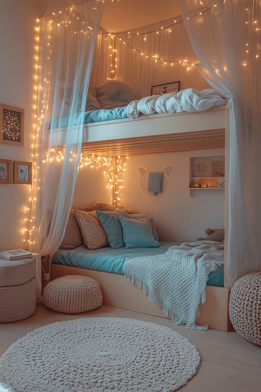Turn your bedroom into a dreamy haven with loft beds for small rooms that include soft canopies and starry-themed decor. The overhead design adds wonder and charm, creating a cozy nighttime escape. Glow-in-the-dark stars and twinkle lights can be added to the rails for extra ambiance. It’s a magical setup that brings comfort and style to compact spaces. Great for both kids and adults who adore celestial aesthetics.