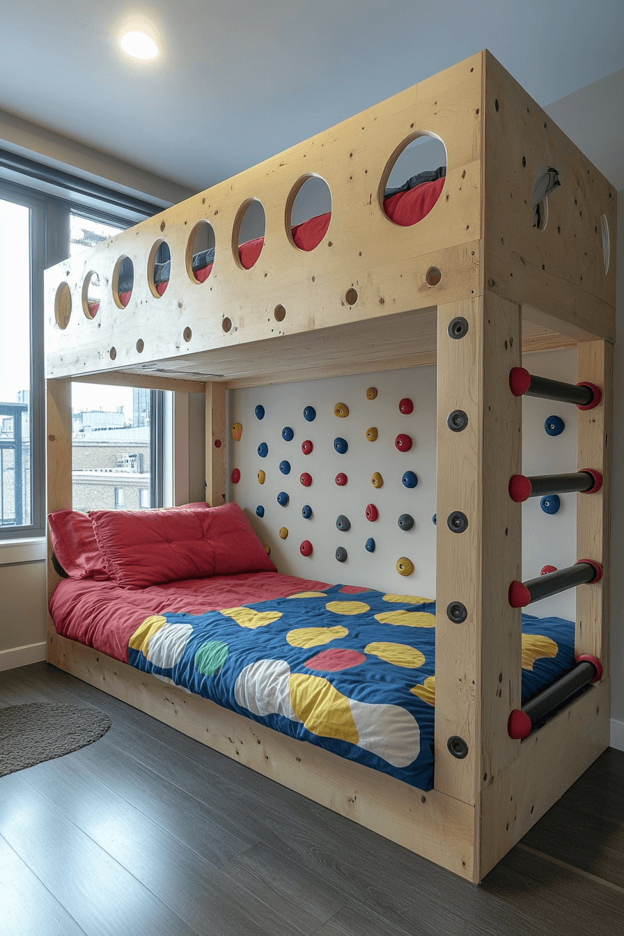 Bring the gym home with loft beds for small rooms that feature built-in fitness zones. Think climbing walls, bars, or ropes under the bed for energy-filled fun. This design turns daily play or exercise into part of your routine without needing extra room. Safe and exciting, it’s perfect for active kids or adventurous teens. Keep them moving while saving space.