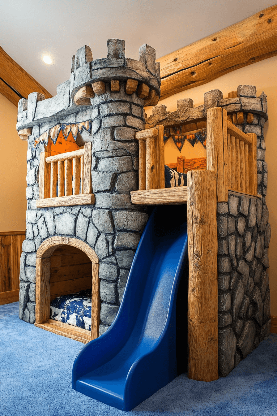 Loft beds for small rooms can spark imagination with whimsical castle-inspired designs. Complete with turrets, slides, and secret hideouts, these beds turn bedtime into a playful experience. They encourage creativity and indoor fun, all while maximizing every inch of your space. Built with safety in mind, these beds are as sturdy as they are magical. It’s the perfect solution for little adventurers with big dreams.