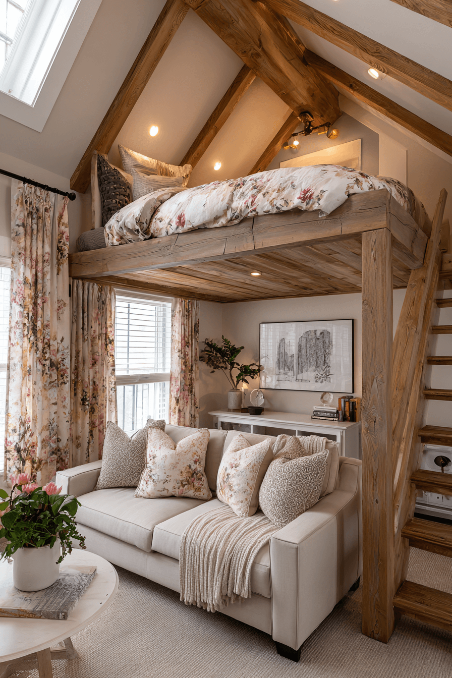 Add elegance with loft beds for small rooms topped with a light, flowing canopy. The draped fabric creates a cozy, enclosed feel while adding a sophisticated touch to your bedroom. Beneath the bed, use the space for a lounge, vanity, or quiet reading spot. It’s romantic, space-savvy, and beautiful all at once. Great for teens or adults seeking luxury in small quarters.