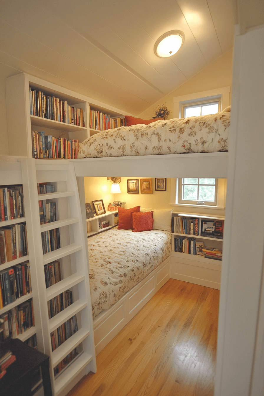 For bookworms, loft beds for small rooms with built-in bookshelves are a total win. The surrounding storage keeps your favorite reads close, creating a mini library right inside your bedroom. This layout saves space and shows off your personality at the same time. It’s cozy, functional, and made for quiet escapes. Perfect for tiny rooms with big literary energy.