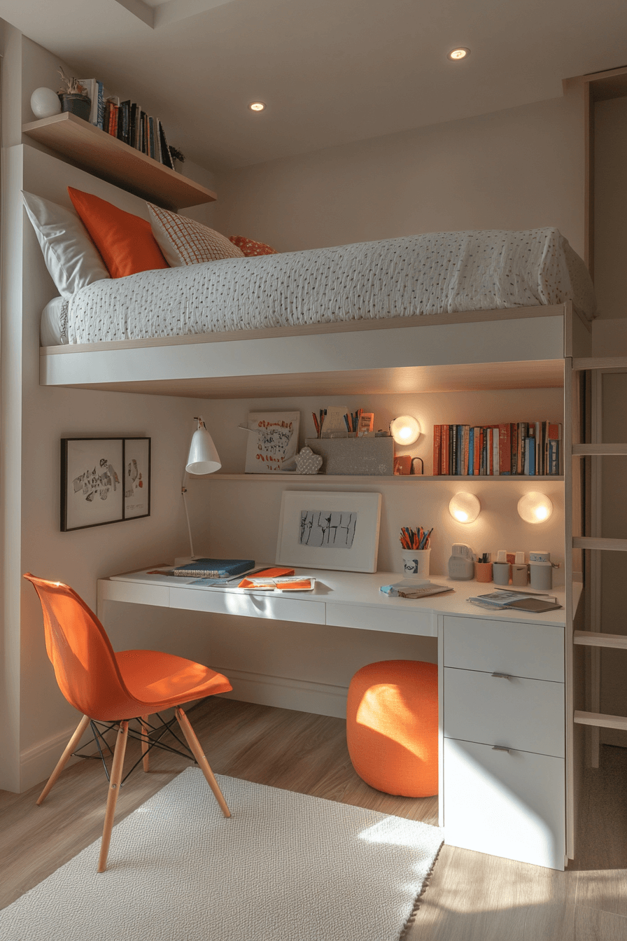 Make the most of compact spaces with loft beds for small rooms that combine a comfy sleep area with a built-in workspace below. This clever vertical setup includes a desk and shelving, perfect for schoolwork, hobbies, or remote jobs. By lifting the bed, you free up precious floor space without sacrificing function. Its clean, modern design brings a spacious feel to even the coziest rooms. Ideal for students, artists, or anyone who loves a tidy layout with style.