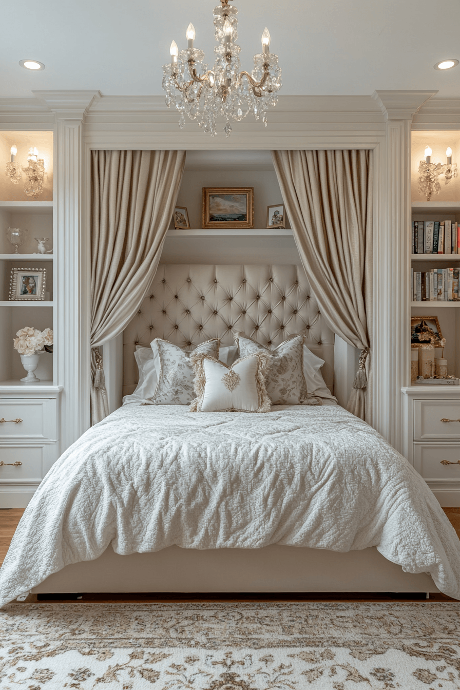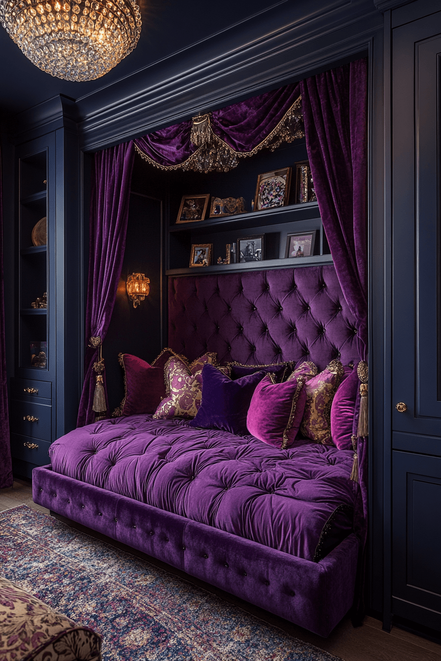 A luxury kids bedroom inspired by a royal retreat transforms the space into a dreamy palace with plush tufted headboards, silky bedding, and elegant gold-accented details. Soft shades of lavender or deep navy create a rich, sophisticated atmosphere that still feels playful and inviting. Sparkling chandeliers or delicate crystal sconces cast a warm glow that elevates the entire room. Layered textures, custom cabinetry, and thoughtful storage keep everything both beautiful and organized. This design sparks imagination while wrapping the space in cozy luxury. Explore more enchanting royal-inspired bedroom ideas now.