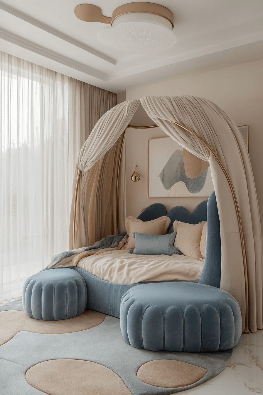 A royal-inspired space meets modern simplicity in this beautifully styled luxury kids bedroom that feels both magical and calming. Structured canopy beds and subtle crown molding bring in that fairytale charm without overwhelming the room. Soft neutrals paired with rich jewel tones create a balanced and elevated palette. Velvet textures and satin drapes add that irresistible, plush finish. The overall vibe feels peaceful yet undeniably regal. Turn your child’s room into a refined castle escape by exploring this look now!