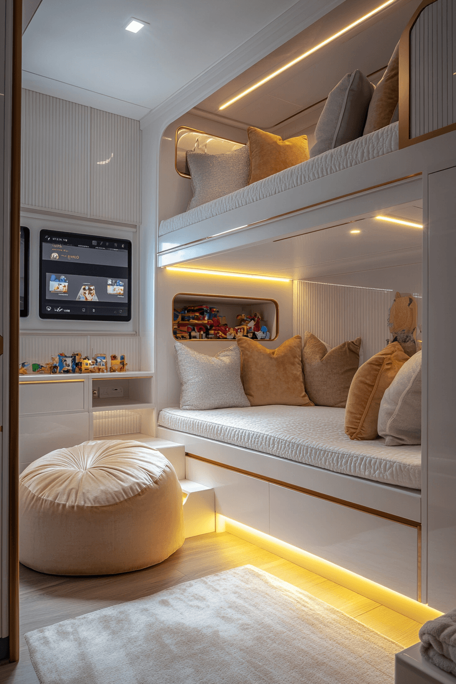 A polished yet playful setup transforms this luxury kids bedroom into the perfect mix of fun and function. Sleek cabinetry keeps toys tucked away while maintaining a clean, stylish appearance. A monochrome base paired with pops of color keeps the room lively and engaging. Soft flooring and built-in lighting add warmth and comfort to the design. Everything feels organized while still inviting creativity and play. Design a polished luxury kids bedroom that feels both fun and elevated right now!