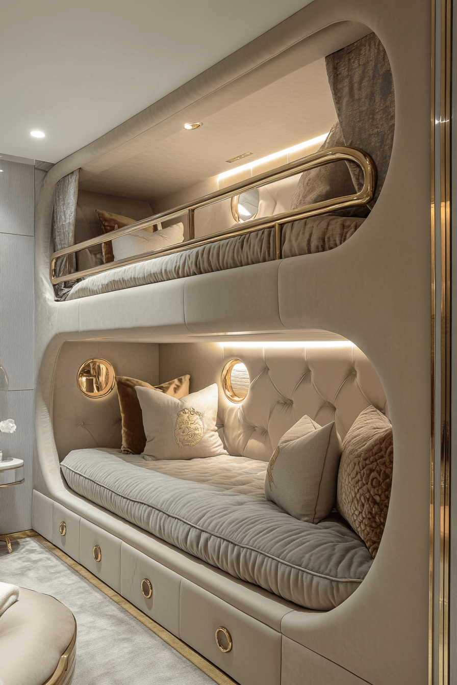 Stacked sleeping gets a serious glow-up in this beautifully designed luxury kids bedroom with couture-inspired bunk beds. Upholstered frames, soft textures, and curated color palettes turn every level into its own cozy retreat. Built-in shelves and personalized lighting make each space feel special and functional. Shades like pale pink, crisp white, or bold monochrome add a fashionable twist. Finishing touches like gold railings or velvet curtains elevate the entire look. Reimagine bunk beds with this elevated luxury kids bedroom idea today!