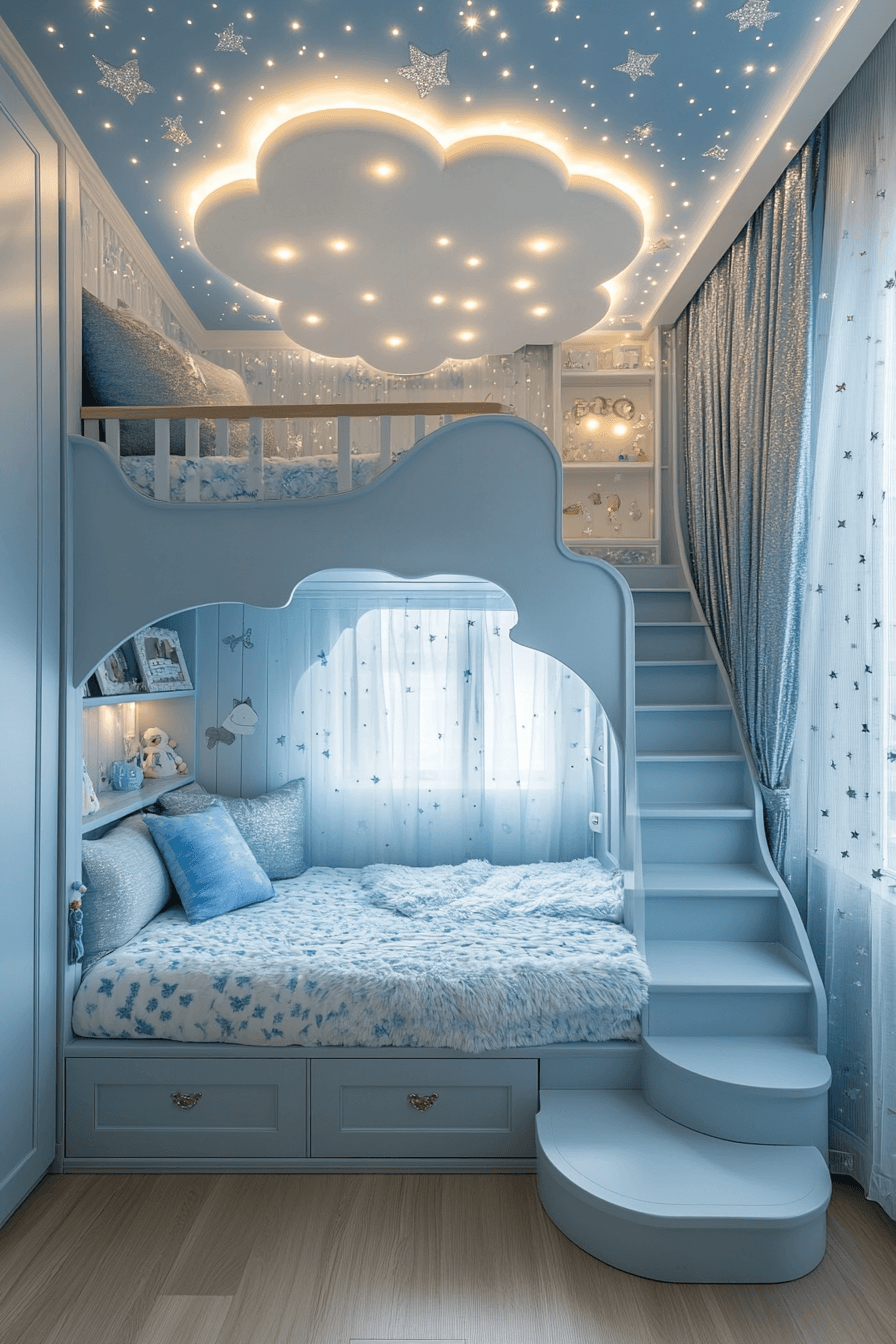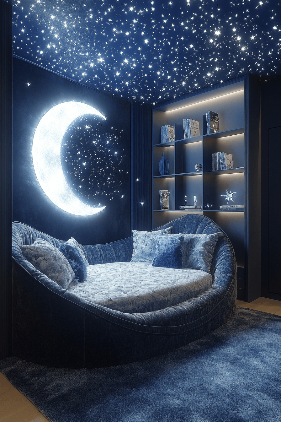 Soft lighting and cozy textures come together to create a relaxing, dreamy atmosphere in this luxury kids bedroom. Dimmable lights allow the room to shift from playful daytime energy to calm nighttime vibes. A plush lounge area invites reading, resting, or simply unwinding in comfort. Shades of deep blue and soft silver mimic a peaceful night sky. Curved furniture adds a gentle flow that makes the space feel even more soothing. Design a calming sanctuary with this moonlit luxury kids bedroom concept today!