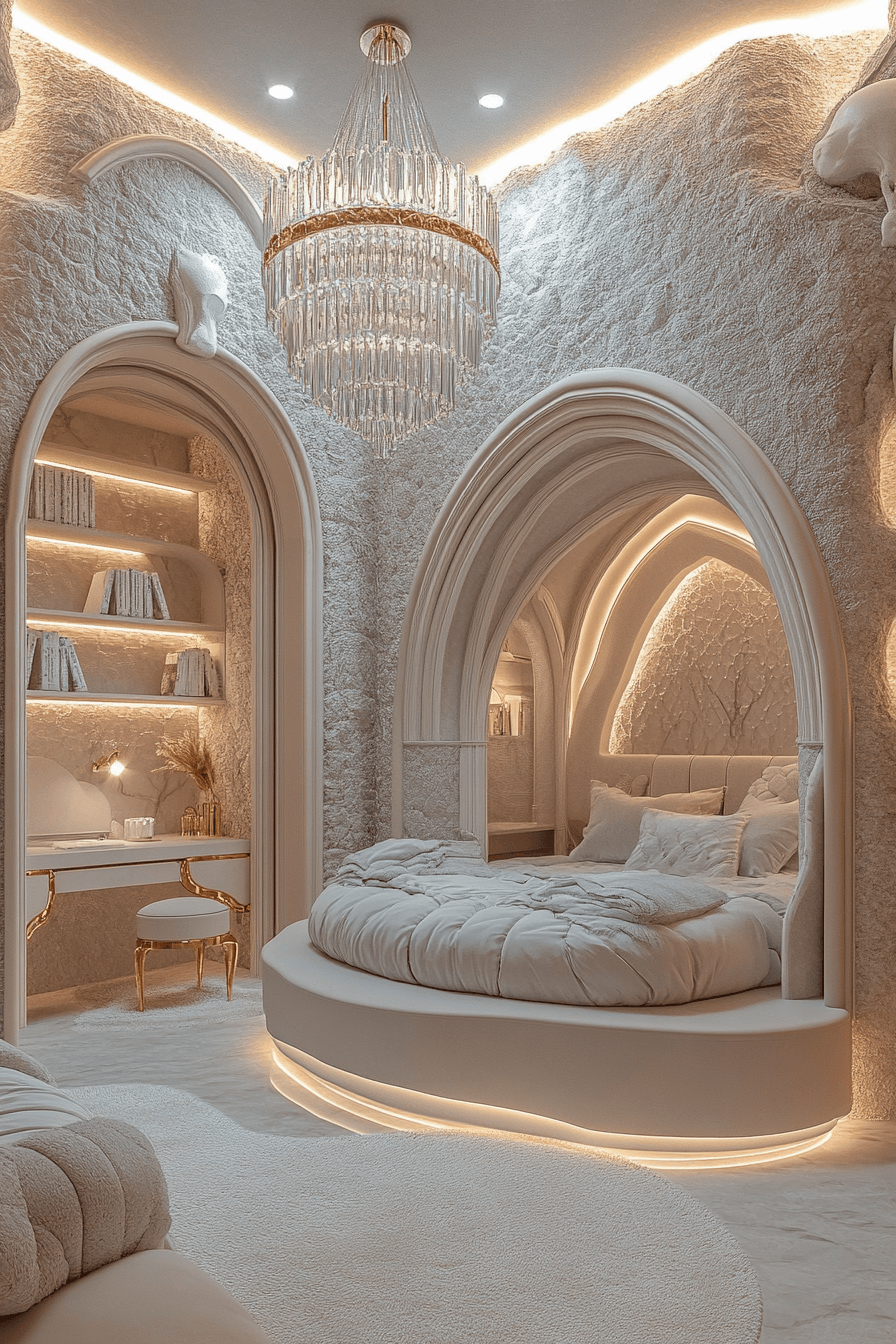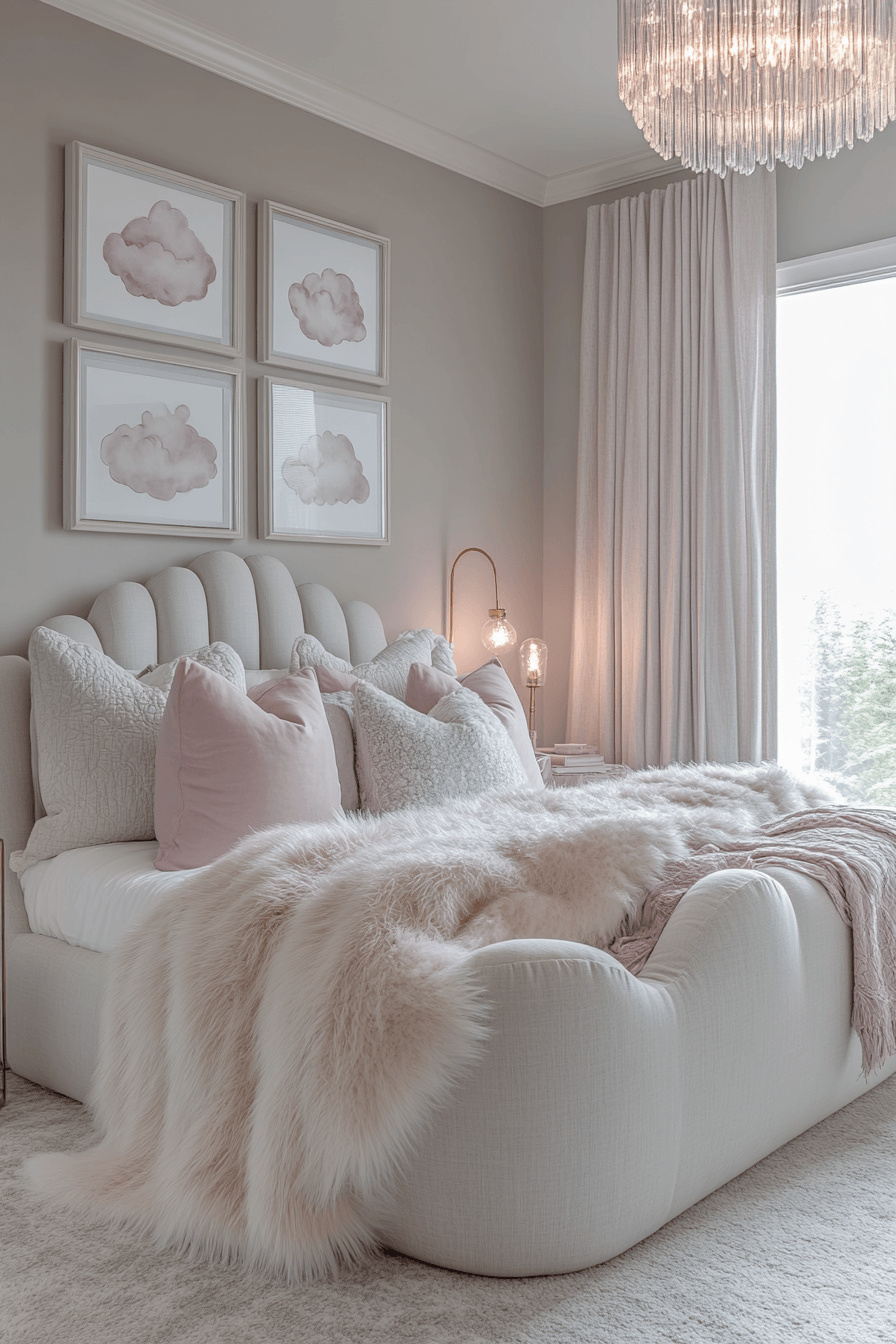 Soft, airy textures transform this luxury kids bedroom into a calming, cloud-like escape full of comfort. Light tones like white and pale gray blend seamlessly with floating shelves and gentle curves. Rounded furniture and plush fabrics enhance the cozy, weightless feeling of the space. Subtle lighting mimics natural daylight, adding to the serene atmosphere. Everything feels soft, peaceful, and effortlessly elevated. Bring a dreamy cloud-inspired luxury kids bedroom to life in your home now!