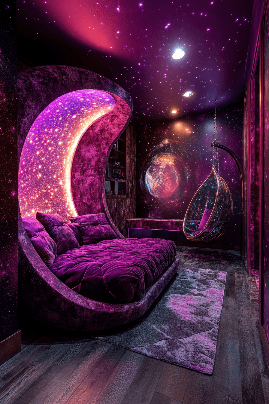 Transforming a space into a luxury kids bedroom with a celestial theme creates a magical escape filled with wonder and imagination. Deep navy tones combined with shimmering silver accents mimic the beauty of a starlit sky. Soft layered rugs and velvet pillows bring warmth while adding a rich, cozy texture. Unique lighting like moon lamps or glowing ceiling stars turns bedtime into an unforgettable experience. This design blends drama with comfort for a truly special atmosphere. Click to explore more galaxy-inspired bedroom ideas.