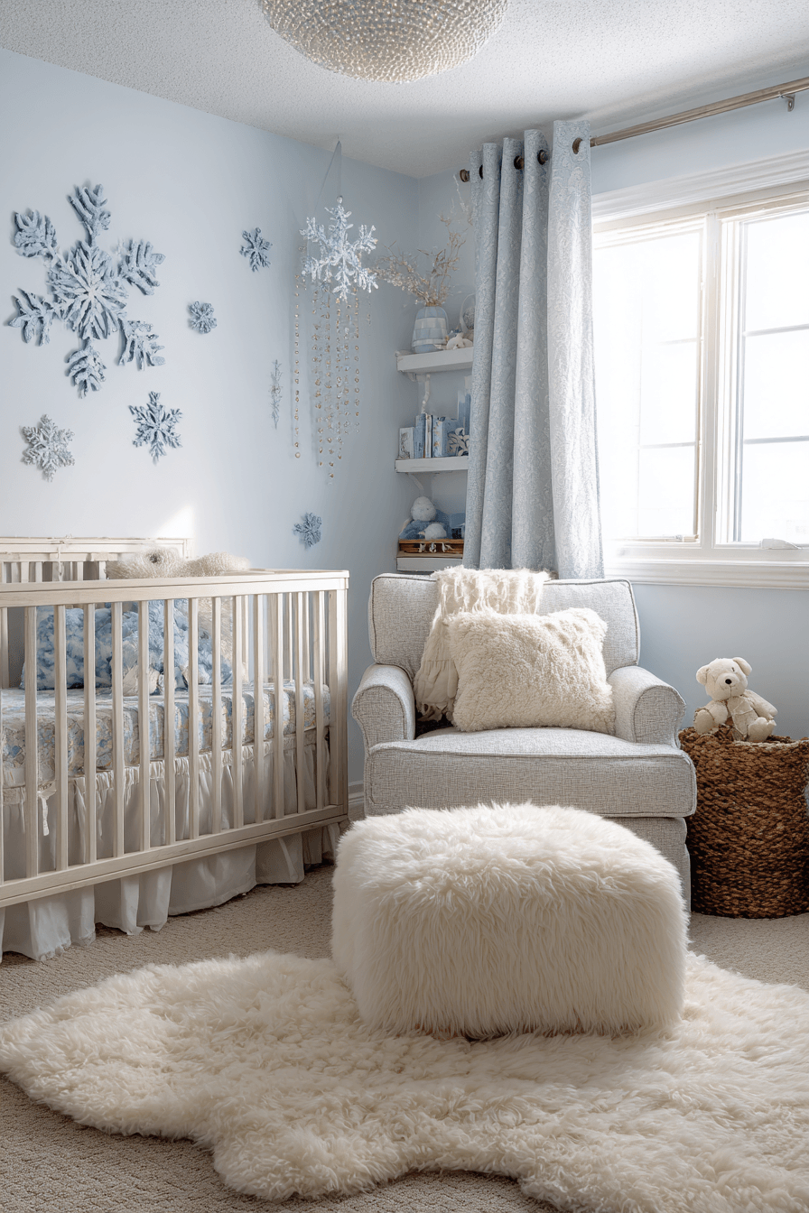 Soft, frosty tones can turn nursery room decor into a dreamy winter-inspired retreat that feels both peaceful and cozy. Shades of icy blue, crisp white, and hints of silver create a gentle, calming atmosphere. Plush textures like faux fur and soft blankets add warmth while keeping the look magical. Subtle shimmer details bring just the right amount of sparkle without overwhelming the space. The overall vibe feels serene, snug, and perfect for restful sleep. Tap to explore more nursery room decor ideas with a winter wonderland feel.