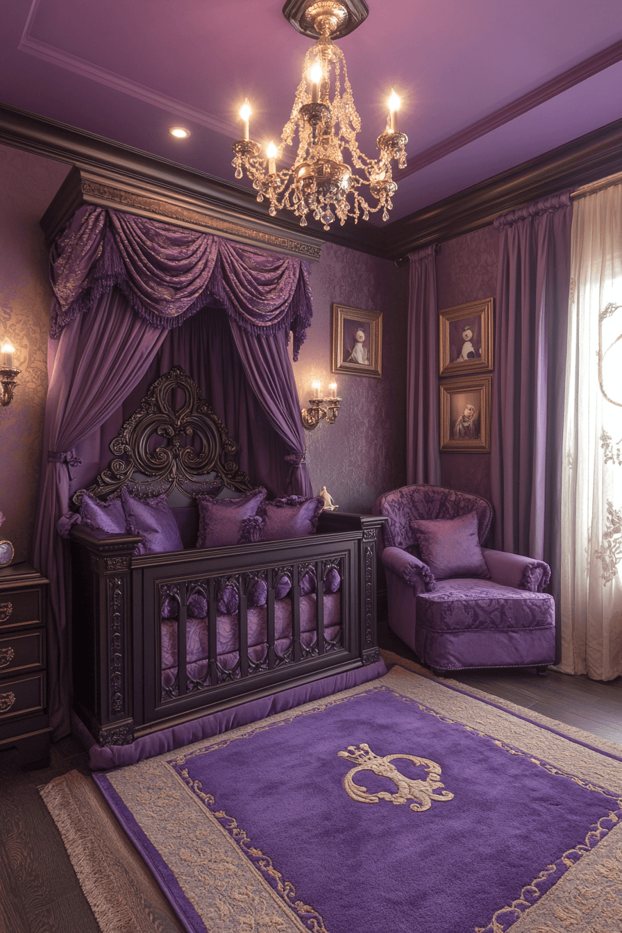 Rich colors and luxurious details can transform nursery room decor into a regal space that feels magical and full of charm. Deep jewel tones like purple paired with gold accents create a warm, elevated look. Plush fabrics and ornate touches add a sense of comfort and elegance. This style brings a dreamy, storybook quality that feels both nurturing and grand. The room feels special, cozy, and full of imagination. Click to discover more nursery room decor ideas with a royal-inspired theme.