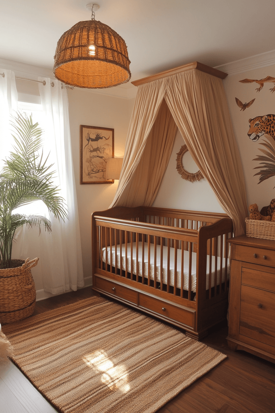Earthy tones and playful patterns can turn nursery room decor into a lively and adventurous jungle-inspired space. Animal prints and safari-themed accents bring excitement while still feeling cozy. Durable fabrics and thoughtful details make the room both fun and functional. This theme encourages curiosity and a love for nature from an early age. The overall vibe feels energetic yet balanced. Tap to explore more nursery room decor ideas with a safari theme.