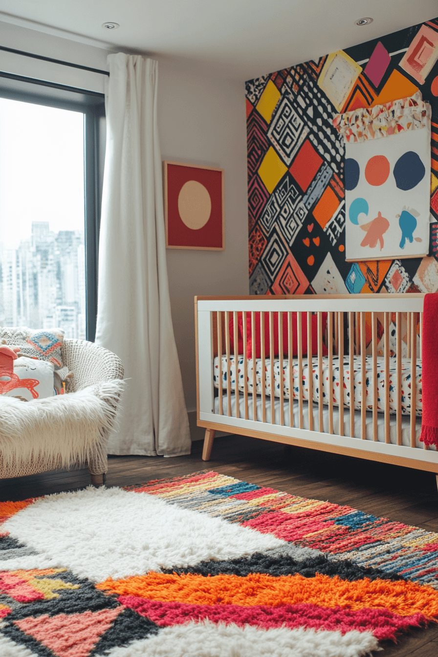 Eye-catching shapes and bold contrasts can bring nursery room decor to life while supporting early visual development. Bright colors and geometric patterns instantly grab attention when used in wallpapers, rugs, or bedding. This energetic style keeps the space playful and engaging without feeling overwhelming. As your child grows, these patterns remain stylish and adaptable. The room feels lively, modern, and full of personality. Tap to explore more nursery room decor ideas with geometric flair.