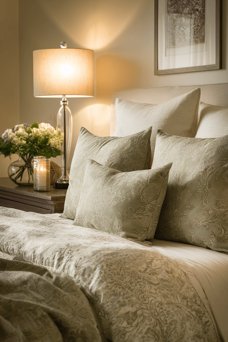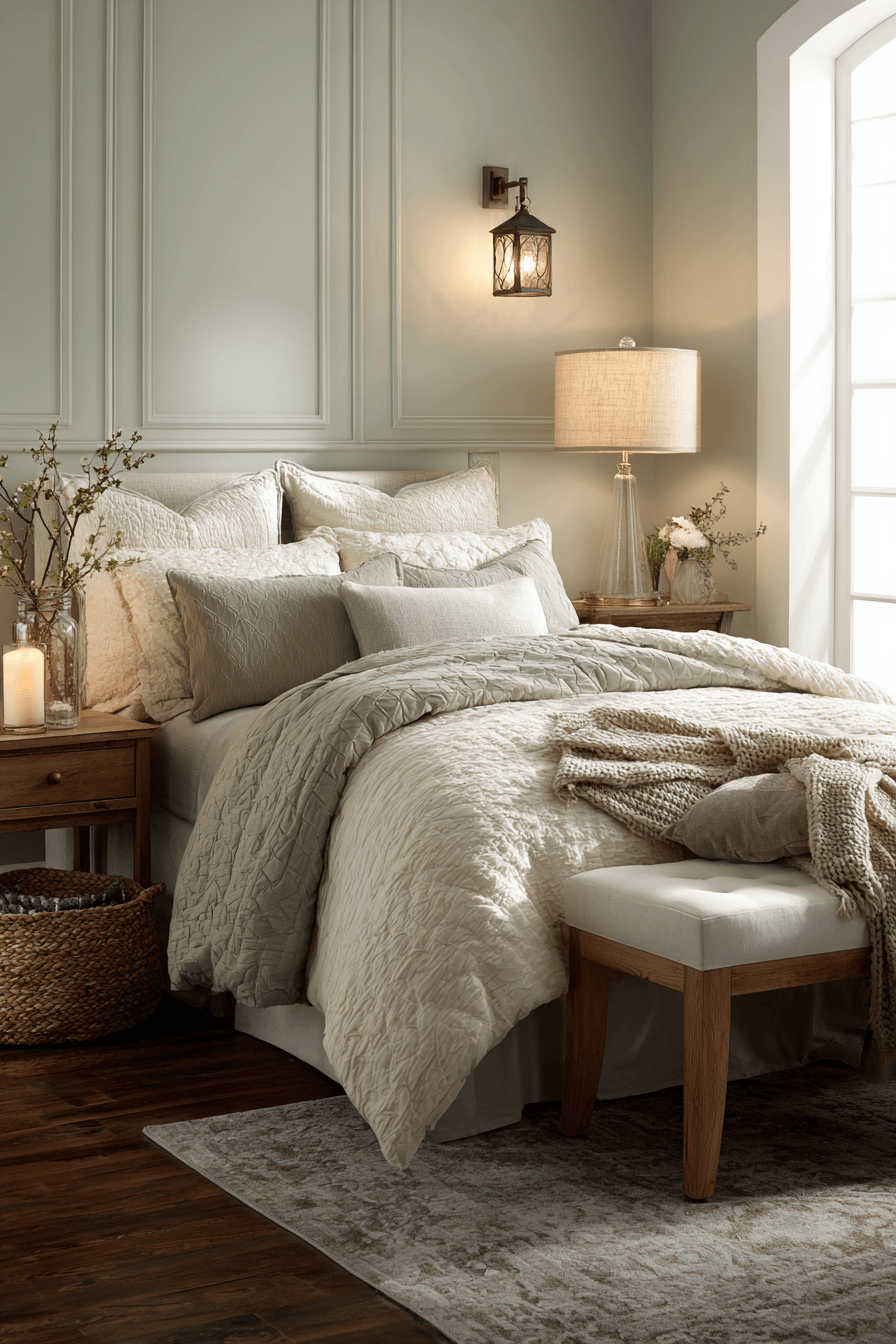 This look is all about creating a soft, glowing atmosphere you’ll love coming home to. A sage green and cream bedroom feels extra cozy when paired with warm lighting and plush cream fabrics. Cream reflects the light beautifully, while sage gently deepens the mood for a balanced effect. Layering in bedside lamps or wall sconces adds depth and dimension. The space ends up feeling warm, inviting, and effortlessly stylish. Bring this glow into your bedroom and enjoy the cozy ambiance.
