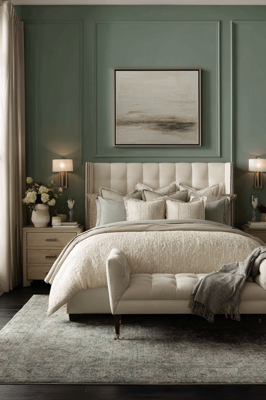 Adding a touch of structure instantly elevates this calming palette. A sage green and cream bedroom feels more refined when styled with tailored furniture and subtle metallic finishes. Cream walls paired with a sage upholstered bed create a focal point that feels balanced and inviting. Matching nightstands or lamps add symmetry and polish without making it feel too formal. The overall look is elegant but still comfortable. Design your own elevated retreat and enjoy that polished feel every day.