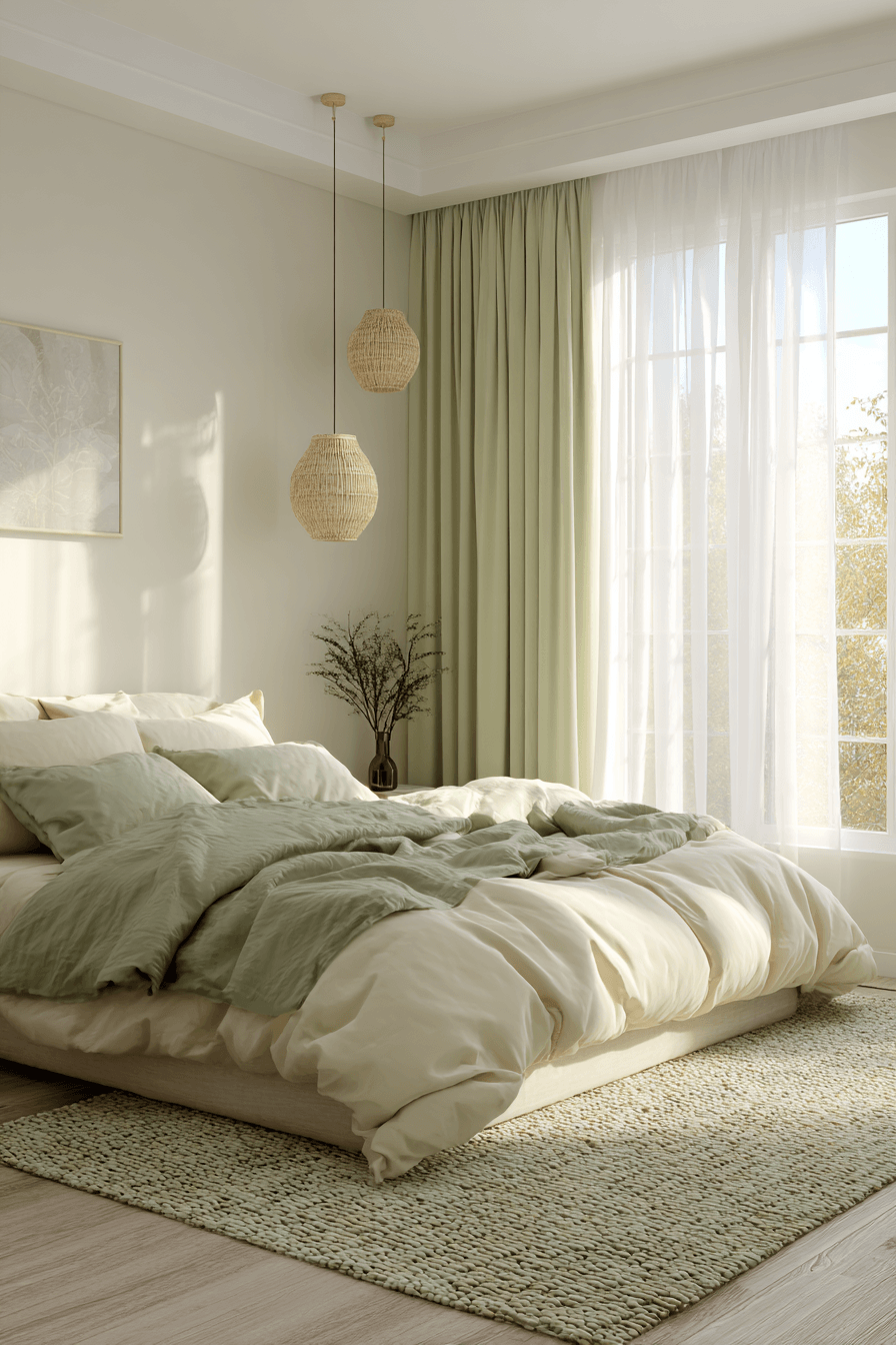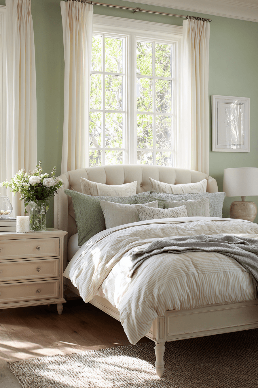 This style is perfect for creating a bright, open atmosphere filled with natural light. A sage green and cream bedroom feels especially airy when cream takes the lead and sage plays a supporting role. Light walls paired with sage bedding or curtains create movement without weighing the room down. The green adds life while keeping everything soft and relaxed. Sheer fabrics and minimal decor help maintain that breezy look. Turn your bedroom into a light-filled escape and enjoy the openness.
