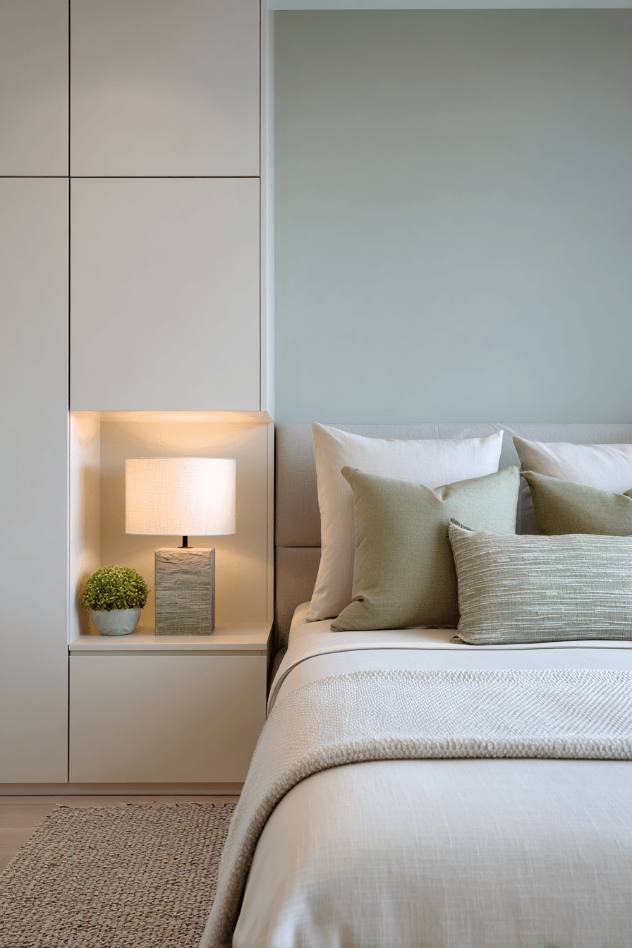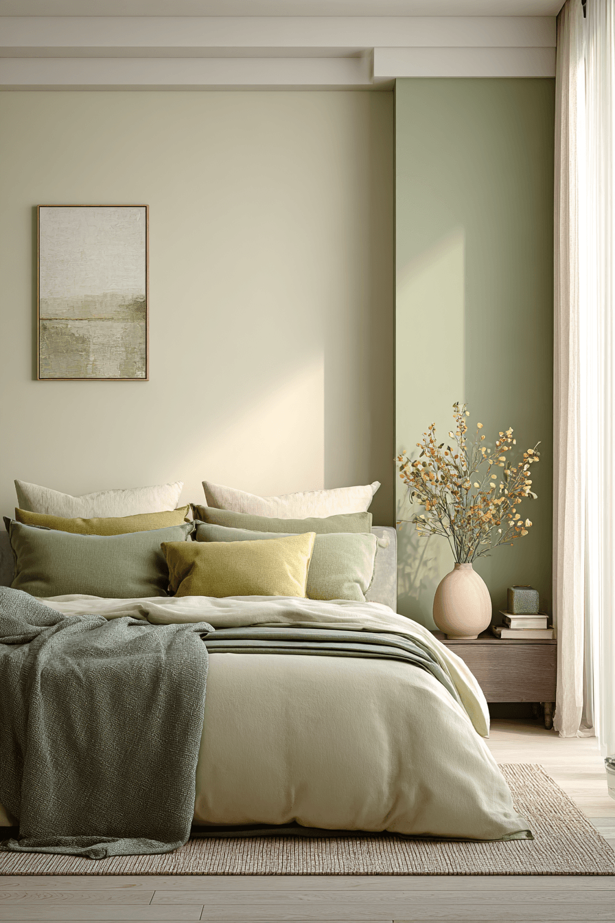 Wrapping your space in creamy neutrals with soft green touches instantly creates a calming atmosphere. A sage green and cream bedroom feels especially soothing because cream keeps things bright while sage introduces a gentle, intentional pop of color. Imagine plush cream bedding layered against a sage headboard for that cozy, elevated look. The contrast stays soft, so the room feels peaceful without looking plain. Warm lighting and textured throws make everything even more inviting. Refresh your space with this calming combination and feel the difference.